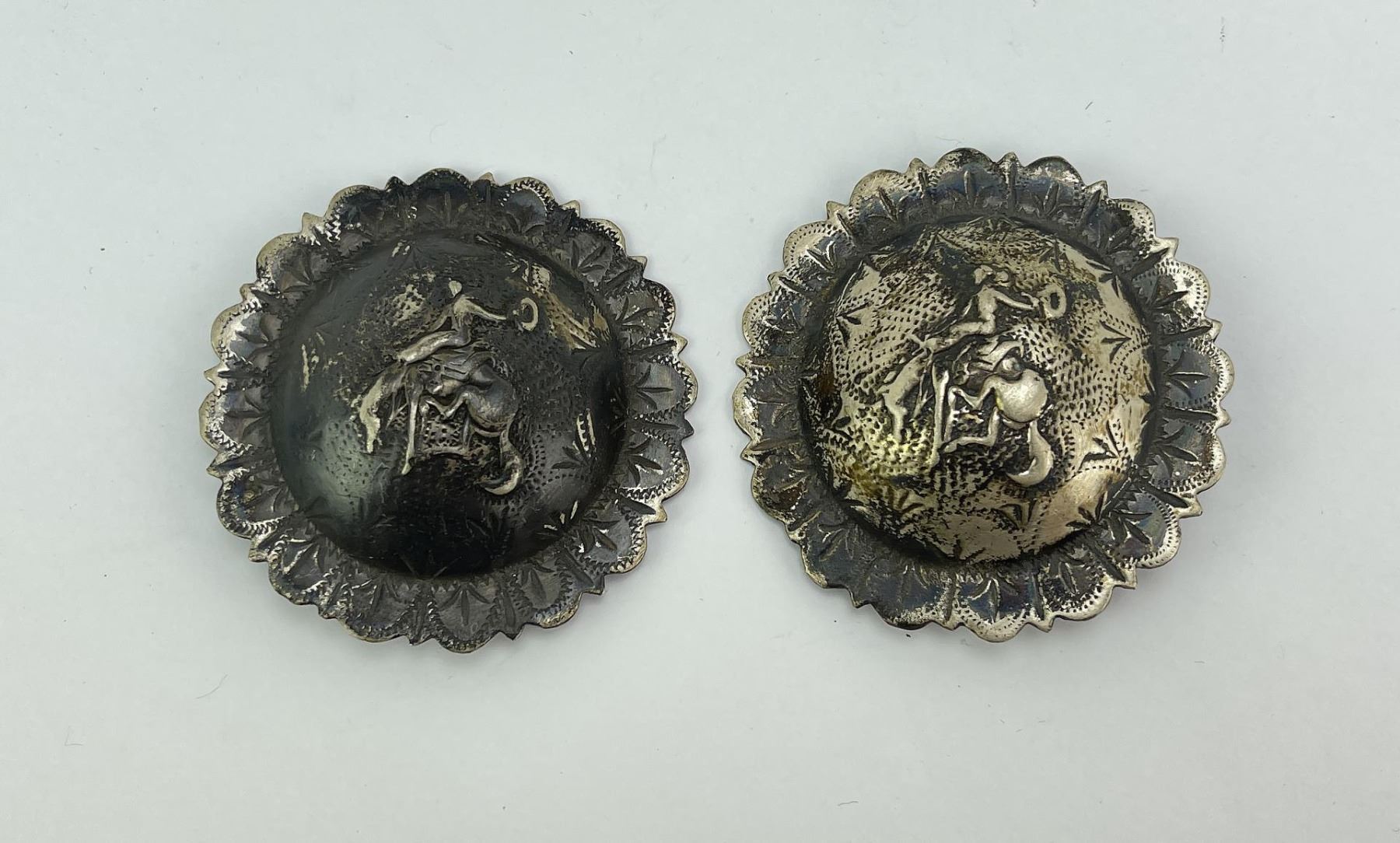 Very nice matched pair of Conchos. Signed as shown. Bucking Bronc rider motif.