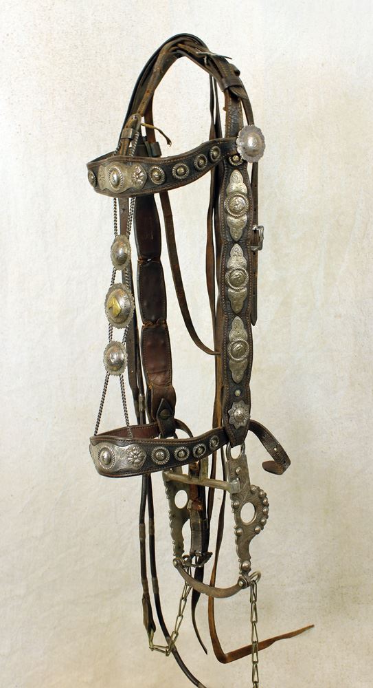 Flat scalloped headstall with beautifully engraved silver conchos and face chain, decorated with horseheads and beautiful California parade style spade bit.