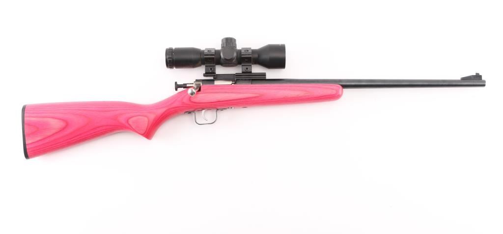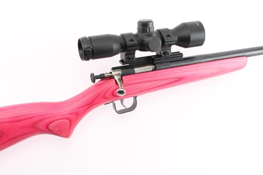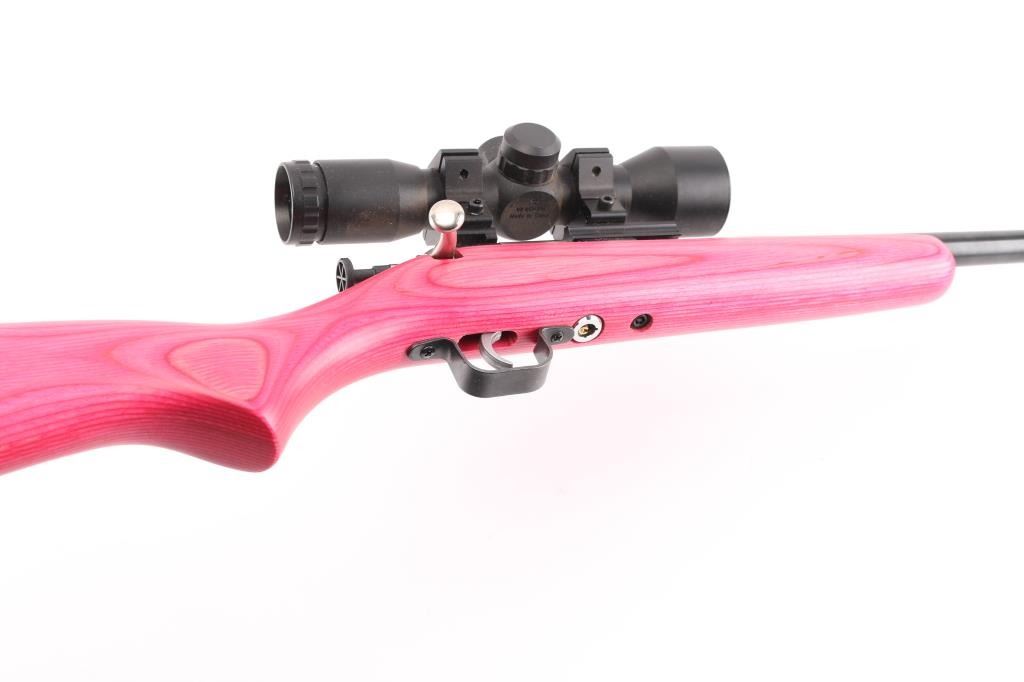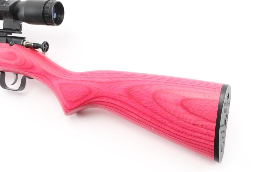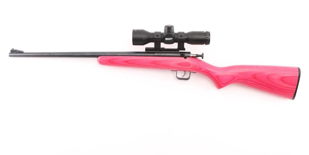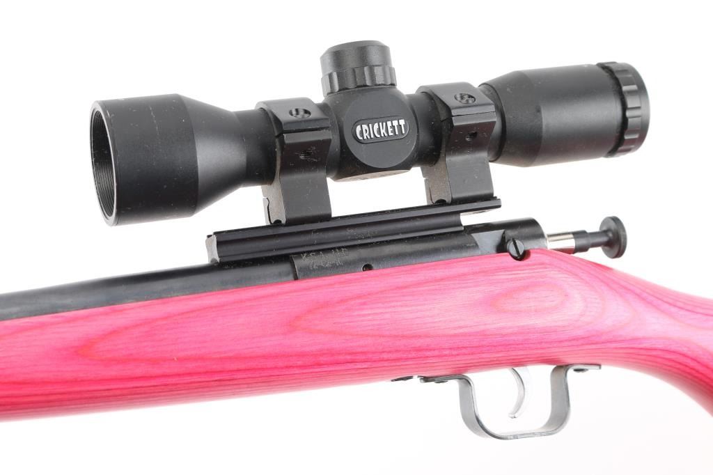 Bolt-action, manual cocking and a single-shot. Made of high quality forged steel & machined low scope bolt handle it puts safety first with a rebounding firing pin automatically blocked, preventing accidental discharge. 16" barrel, ramped front blade, mounted with a Cricket 4x323mini at 35 yds scope, 30" O/A. Pink laminate stock. Stainless bolt, blue finish.. Bore is excellent/bright. Like new condition. NRA Condition-Excellent. Modern Firearm.