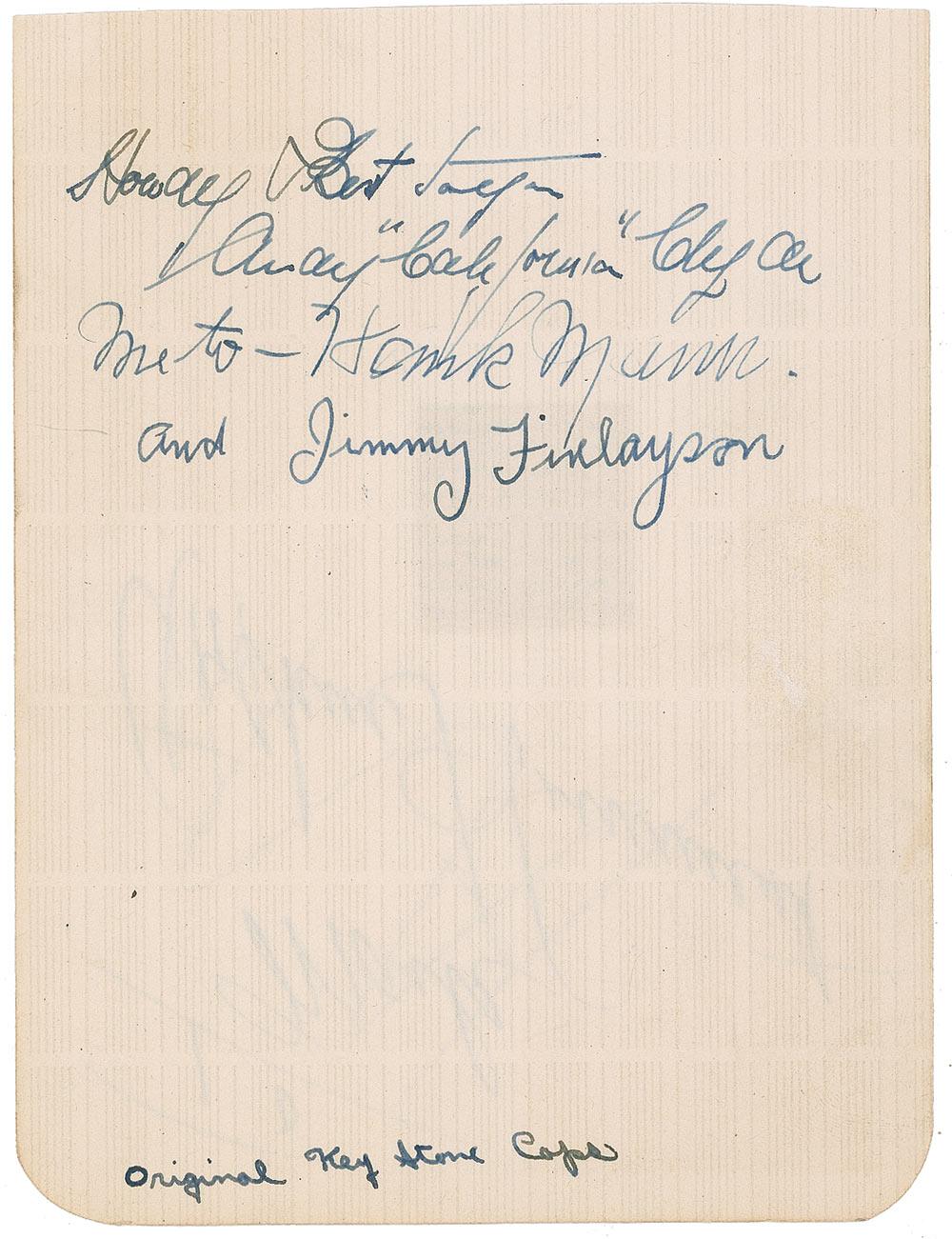 Vintage fountain pen signatures, “Howdy & Best to you, Andy ‘California’ Clyde,” “Hank Mann,” adding “me too,” and “Jimmy Finlayson,” on an off-white 4.5 x 6 album page. In fine condition, with a small area of surface loss to right edge, and slight show-through from signature on reverse. Jimmy Finlayson was also well know for his roles supporting Laurel and Hardy in many of their Hal Roach features and two-reelers.