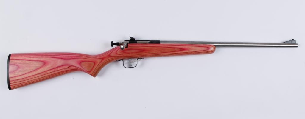 Single shot bolt action rifle made for beginner shooters. Adjustable rear sight, Pinkish red colored wood stock. Excellent bore and action. Includes original box. Condition: Excellent