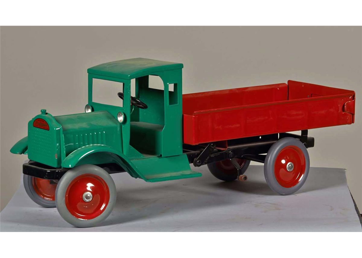 Restored in green and red with grey metal tires and working steering wheel. Condition (Restored). Size 26" L.