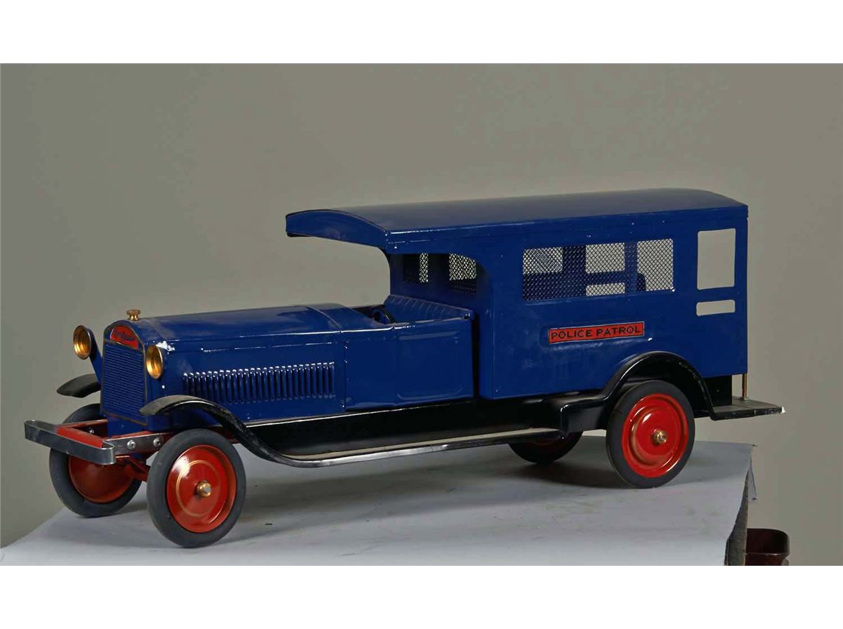 Pressed steel with mesh side windows. Restored in blue with red wheels and rubber tires. Has working steering wheel by Buffalo Commons Creations. Condition (Restored). Size 29" L.