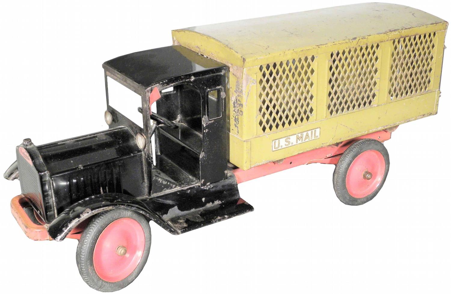 Keystone Pressed Steel Toy Mail Truck. Packard model with screen sides. Green and black. Most of original paint intact. Normal wear, scratches and minor rust otherwise good condition. 26 3/4 inches long.