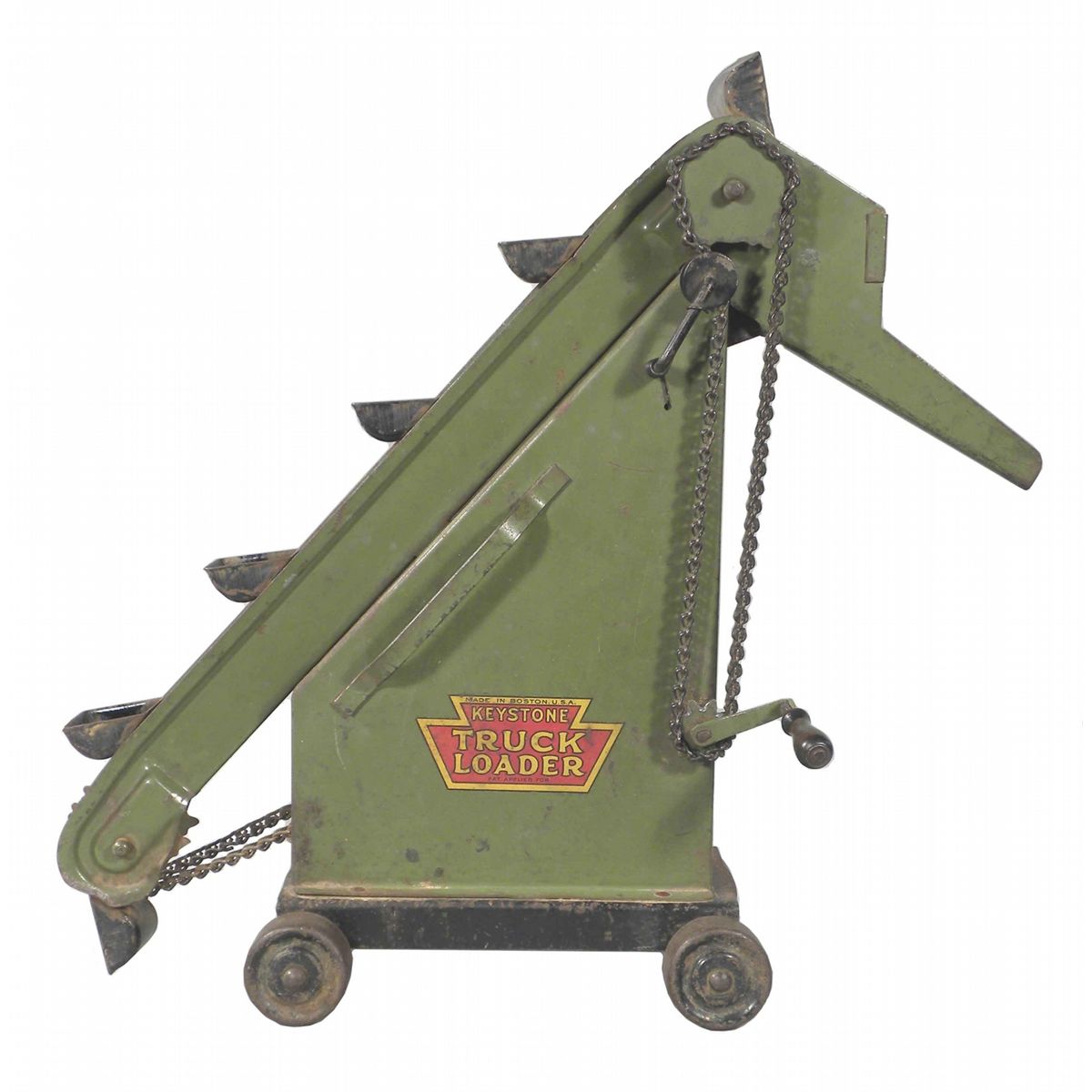 Keystone Pressed Steel Toy Sand Loader. Upright model, chained buckets controlled by side lever with original decals. Companion piece to trucks. 17 1/2 inches tall.