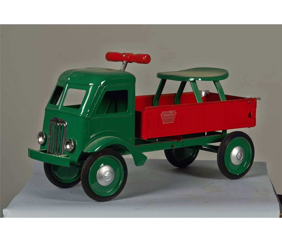 Restored with green tractor and seat with red trailer and steering handle. Condition (Restored). Size 27" L.