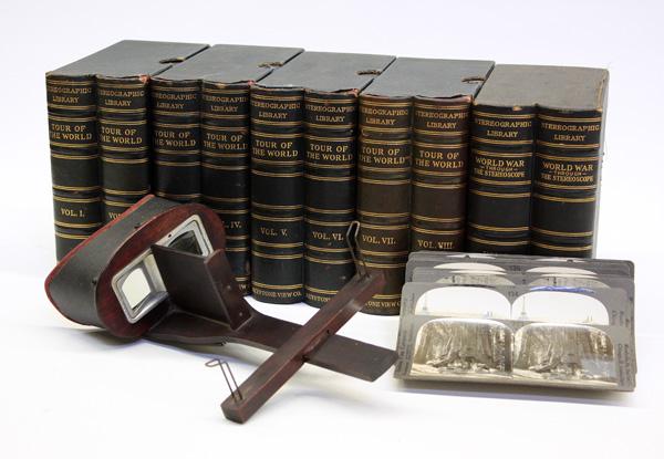 (lot of 7) Keystone View Co. stereo-views, including the Stereographic Library Tour of the World, eight volumes in slip cases, Volumes I, II, III, IV, V, VI, VII, VIII, and ''World War Through the Stereoscope'', Volumes I and II, one bag containing eighteen associated stereo-views, and a period Stereographic viewer, each Stereographic Library volume 8''h x 4''w x 7''d
