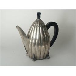 Ezüst 618 g, henger alakú bordázott díszítésu keskenyedo test zsanéros fedéllel fekete fa fogógombbal és sérült füllel. Jelzett magyar, 1930-as évek, M.: 23 cm