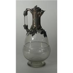 Kerek talpon fúvott öblösödo színtelen üveg, zsanérosan nyíló ezüstözött ón tetovel és füllel, levélmintás díszítéssel, Jelzett angol, XIX. sz. vége, M.: 26 cm