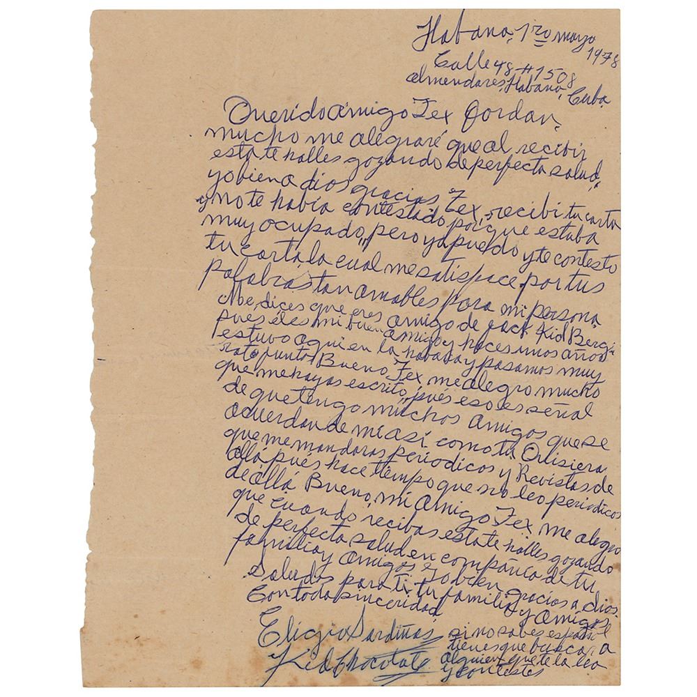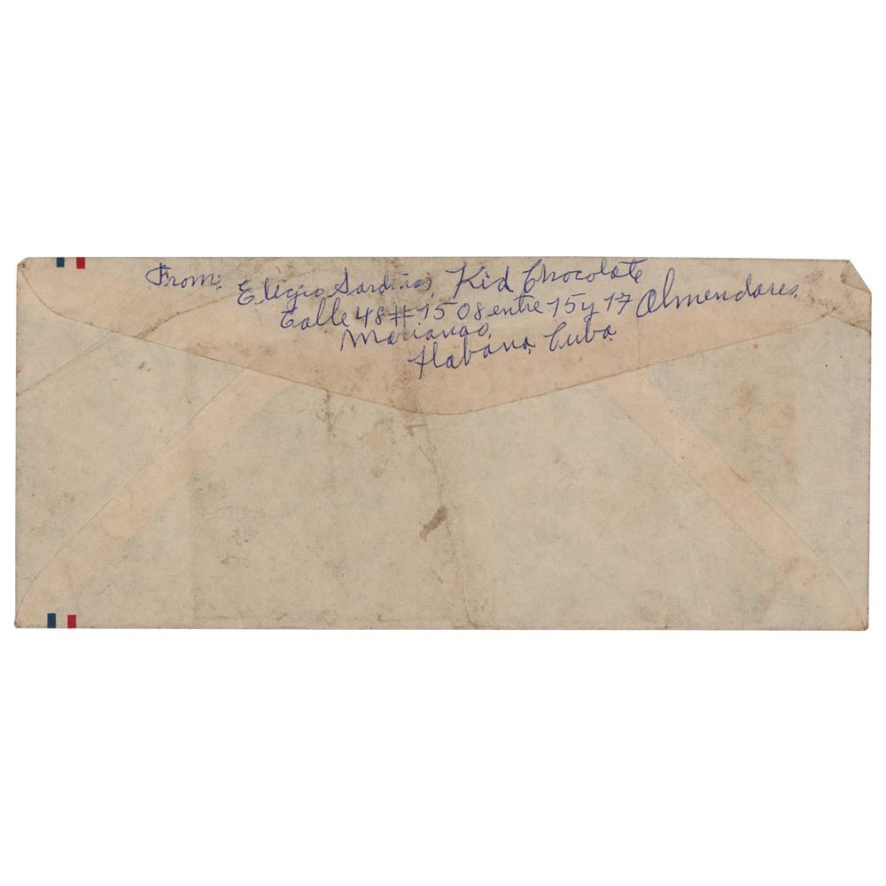 Cuban boxer (1910–1988) who enjoyed success both in the ring and in society life during the 1930s; he became Cuba's first world boxing champion when he knocked out defending world Junior Lightweight champion Benny Bass. Rare ALS in Spanish, signed “Eligio Sardinas, Kid Chocolate,” one page, 6.25 x 8, May 20, 1978. Handwritten letter to Tex Gordon, in part: (translated): “I will be very glad that upon receiving this you find yourself enjoying perfect health. I'm fine, thank you Tex, I received your letter and I hadn't answered because I was very busy but I can and I answer your letter which satisfied me with your words that were so kind to me. You tell me that you are a friend of Jack Kid Berg, well, you are my good friend and a few years ago we spent a lot of time in Havana. Well, Tex, I'm very glad you wrote to me. That's a sign that I have many friends who remember me, just like you. I'd like you to send me newspapers. Well my friend Tex I am glad that when you receive you are enjoying perfect greetings in the company of your family and friends.” In fine condition, with scattered small stains in the signature area. Accompanied by the original mailing envelope hand-addressed by Sardinas, who incorporates his signatures into the return address field on the reverse flap, “Eligio Sardinas, Kid Chocolate.”