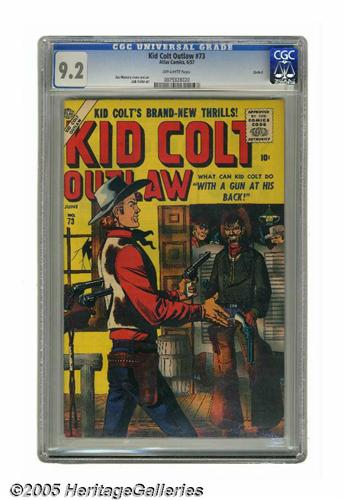 <B>Kid Colt Outlaw #73 Circle 8 pedigree (Atlas, 1957) CGC NM- 9.2 Off-white pages.</B></I> Joe Maneely cover. Maneely and Jack Keller art. This is the only copy of this issue that CGC has certified to date. Overstreet 2005 NM- 9.2 value = $70. CGC census 3/05: 1 in 9.2, none higher.