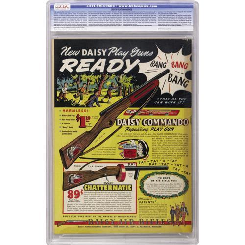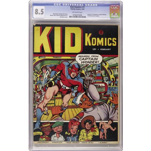 <B>Kid Komics #1 (Timely, 1943) CGC VF+ 8.5 Off-white pages.</B></I> The cover star of this first issue sure looked like a winner -- Captain Wonder, decked out in red and blue tights, and brandishing a sub-machine gun, smashing his way into a Japanese World War II submarine -- what a hero! What happened after his first adventure (and origin) here is a mystery, because this was the good Captain's only appearance. Surviving on for another handful of issues were Young Allies charter members Whitewash and Knuckles, who appear alongside Subbie the Sea-Going Lad, young cowhand Pinto Pete, and mini-vixen Trixie Trouble. Syd Shores provided the colorful cover, while Bob Oksner, Don Rico and that mad doodler, Basil Wolverton, fill the pages inside. This exceptional example is surpassed by only one other copy in the current CGC census report. Overstreet 2006 VF 8.0 value = $2,874; VF/NM 9.0 value = $4,837. CGC census 10/06: 1 in 8.5, 1 higher.<BR><BR><b>Shipping:</b> Slabbed Comic (<a target="_blank" href="http://www.heritageauctions.com/common/shipping.php">view shipping information</a>)