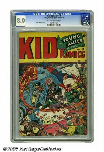 <B>Kid Komics #10 (Timely, 1945) CGC VF 8.0 Cream to off-white pages.</B></I> The Young Allies make their last stand in this issue, which would change to <B>Kid Movie Komics</B></I> with #11, starring Ziggy Pig. Alex Schomburg contributes a typically rousing cover illustration, showing the boys busy bashing in the skulls of a few bad guys who dared to hold up an armored car on <I>their</B></I> watch! Ouch! With crimefighters like these, no wonder the world was safe for funny animals next time out. This copy looks pretty sharp, with smooth, flat surfaces and vivid cover colors. Overstreet 2005 VF 8.0 value = $531. CGC census 6/05: 1 in 8.0, none higher.