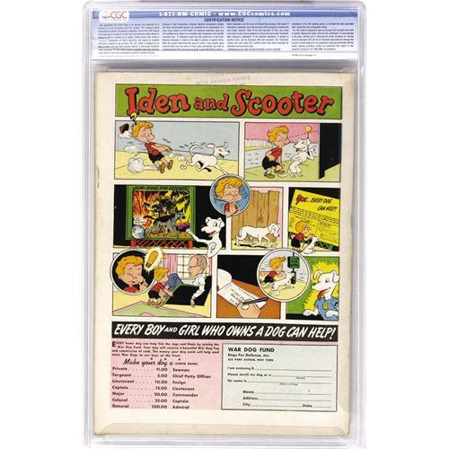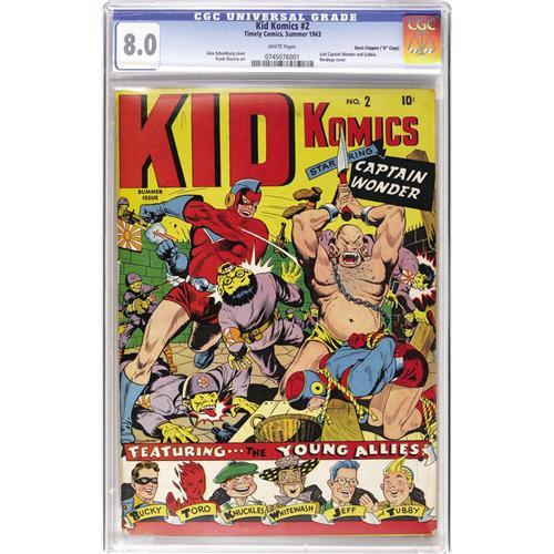 <B>Kid Komics #2 Davis Crippen ("D" Copy) pedigree (Timely, 1943) CGC VF 8.0 White pages.</B></I> It will take more than the nine Japanese baddies on this Alex Schomburg cover to make Captain Wonder work up a sweat, although sidekick Tim looks a bit apprehensive! Overstreet 2006 VF 8.0 value = $1,250. CGC census 7/06: 1 in 8.0, 1 higher. <I>From the Crippen Collection</B></I>. <BR><BR><B>Important notice:</B> Heritage usually auctions material at the rate of 200-250 lots per hour. On some occasions eBay Live bid software or the Internet may not be able to keep up with the pace of the auction. We recommend placing a realistic absentee bid now as insurance to avoid disappointment. Occasionally the auctioneer may eliminate or reject an eBay Live bid, and the auctioneer may also reopen a lot after the close of the eBay live bidding (usually because we missed an audience bid), and may reject your bid even if it shows you as the winning bidder. By bidding via eBay Live, you agree that Heritage may award the lot to another bidder at its sole discretion under the circumstances described above or any other reasonable circumstances. Since eBay bids are not shown to us until we open the lot on the floor, we treat those bids just like floor bids. In most cases the floor responds before the eBay bid is presented to us, due to Internet lag time, so for consistency we have made it a policy that floor bids are always considered first over tie eBay live bids. Also please note that all Heritage lots purchased through eBay Live carry a 22.5% Buyer's Premium. Please make sure you read the Terms and Conditions before you bid. This lot is being auctioned in conjunction with a live floor auction by Heritage Auction Galleries. All final auction and invoice information will be supplied by Heritage Auction Galleries, and all other information should be considered preliminary. Lot:41001 <BR><BR><B>Winning Notification and Billing:</B> After the FINAL session in this auction is complete, Heritage will send e-mail and snail mail invoices. This process normally takes several days. All final auction and invoice information will be supplied by Heritage Auction Galleries, and all other information should be considered preliminary. <BR><BR>This auction will be conducted on a live auction floor and over the Internet through eBay Live. If you choose to place an absentee bid, please take a moment to <font color='#0000ff'><u><a href='http://pages.ebay.com/liveauctions/help/before/laabsentee.html'>learn how eBay Live absentee bidding works</a></u></font><font color='#000000'>