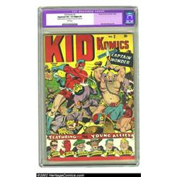 Kid Komics #2 (Timely, 1943) CGC Apparent VG+ 4.5 Slight (P) White pages. Why let a little thing like restoration come between you and a book that looks this good? The Schomburg cover alone is worth the paltry sum of your winning bid. There's nothing wrong with the interior pages; they're white! Of the slight professional restoration CGC notes "Restoration includes: cover cleaned and pressed, cover reinforced." Overstreet 2002 GD 2.0 value = $173; FN 6.0 value = $519. Important notice: We expect to be auctioning lots at the rate of 200-250 per hour. Sometimes eBay Premier live bid software cannot keep up with that pace, so we strongly recommend that you place a realistic proxy bid now as insurance to avoid disappointment. Also please note that all Heritage/CAA lots purchased through eBay Premier carry a 20% Buyer's Premium. Please make sure you read the Terms and Conditions.
