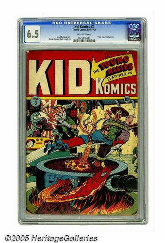 <B>Kid Komics #3 (Timely, 1943) CGC FN+ 6.5 Off-white pages.</B></I> The Young Allies are featured on another great Alex Schomburg World War II torture cover, complete with a vat of boiling oil! It's action all the way in this great issue, which features the Vision, Daredevils, and Red Hawk. Story art is provided by George Klein and Harry Douglas. Overstreet 2005 FN 6.0 value = $450; VF 8.0 value = $938. CGC census 7/05: 1 in 6.5, 6 higher.