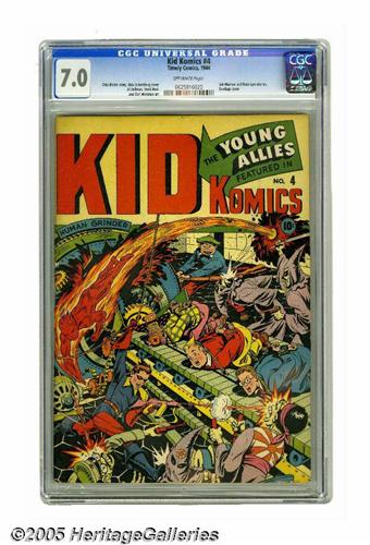 <B>Kid Komics #4 (Timely, 1944) CGC FN/VF 7.0 Off-white pages.</B></I> Into the Human Grinder machine go the Young Allies! Can Bucky and Toro save them in time? This thrill-packed Alex Schomburg World War II cover is sure to please his many fans, as will this tight and attractive copy. The Sub-Mariner and the Destroyer also appear inside this great Timely. Interior art is provided by Al Bellman, Frank Beck, and Bert Whitman. Overstreet 2005 FN 6.0 value = $375; VF 8.0 value = $781. CGC census 7/05: 1 in 7.0, 3 higher.