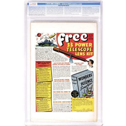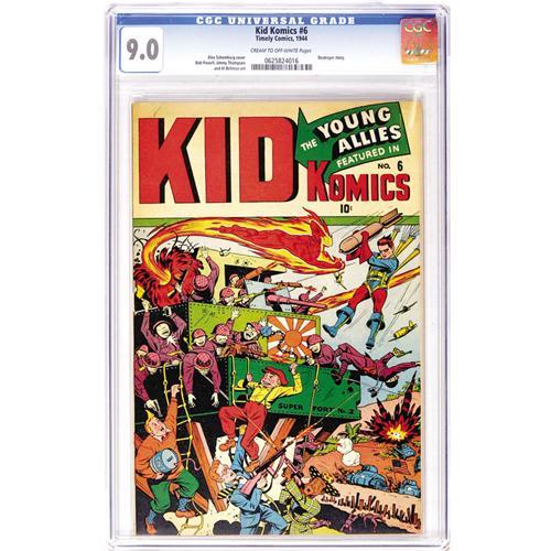 <B>Kid Komics #6 (Timely, 1944) CGC VF/NM 9.0 Cream to off-white pages.</B></I> Bucky hand-delivers a bomb to the Japanese while Toro and the Young Allies whip up on them with a virtual arsenal of other goodies. We are also treated to a Destroyer story in this ish. Alex Schomburg delivers the hard-hitting cover art and Bob Powell handles the interior art chores. Our copy has yet to be eclipsed in the current CGC census. Overstreet 2006 VF/NM 9.0 value = $950; NM- 9.2 value = $1,300. CGC census 7/06: 1 in 9.0, none higher. <BR><BR><B>Important notice:</B> Heritage usually auctions material at the rate of 200-250 lots per hour. On some occasions eBay Live bid software or the Internet may not be able to keep up with the pace of the auction. We recommend placing a realistic absentee bid now as insurance to avoid disappointment. Occasionally the auctioneer may eliminate or reject an eBay Live bid, and the auctioneer may also reopen a lot after the close of the eBay live bidding (usually because we missed an audience bid), and may reject your bid even if it shows you as the winning bidder. By bidding via eBay Live, you agree that Heritage may award the lot to another bidder at its sole discretion under the circumstances described above or any other reasonable circumstances. Since eBay bids are not shown to us until we open the lot on the floor, we treat those bids just like floor bids. In most cases the floor responds before the eBay bid is presented to us, due to Internet lag time, so for consistency we have made it a policy that floor bids are always considered first over tie eBay live bids. Also please note that all Heritage lots purchased through eBay Live carry a 22.5% Buyer's Premium. Please make sure you read the Terms and Conditions before you bid. This lot is being auctioned in conjunction with a live floor auction by Heritage Auction Galleries. All final auction and invoice information will be supplied by Heritage Auction Galleries, and all other information should be considered preliminary. Lot:41001 <BR><BR><B>Winning Notification and Billing:</B> After the FINAL session in this auction is complete, Heritage will send e-mail and snail mail invoices. This process normally takes several days. All final auction and invoice information will be supplied by Heritage Auction Galleries, and all other information should be considered preliminary. <BR><BR>This auction will be conducted on a live auction floor and over the Internet through eBay Live. If you choose to place an absentee bid, please take a moment to <font color='#0000ff'><u><a href='http://pages.ebay.com/liveauctions/help/before/laabsentee.html'>learn how eBay Live absentee bidding works</a></u></font><font color='#000000'>