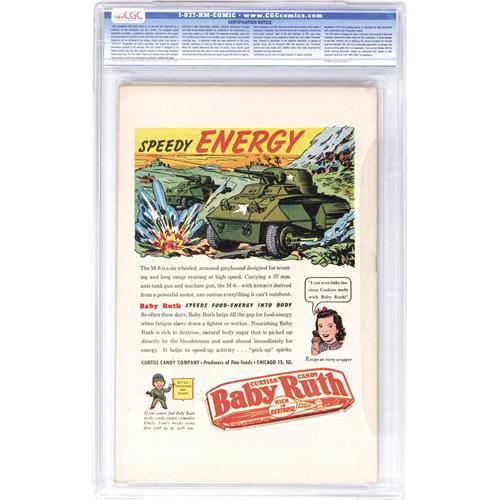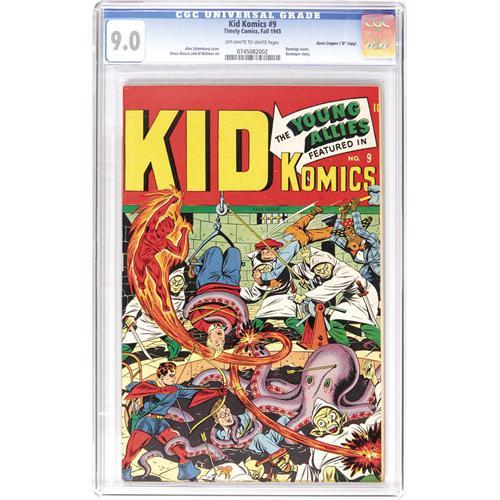 <B>Kid Komics #9 Davis Crippen ("D" Copy) pedigree (Timely, 1945) CGC VF/NM 9.0 Off-white to white pages.</B></I> The unread copies from the Davis Crippen collection have amazed us again and again, as they far surpass anything you'd find "in the wild." Just look at this one's perfect spine and excellent edges. The Alex Schomburg cover is another of his frantic mini-masterpieces. Those boy protagonists the Young Allies are the stars of the book; the Destroyer appears in a backup feature. Overstreet 2006 VF/NM 9.0 value = $841; NM- 9.2 value = $1,150. CGC census 6/06: 1 in 9.0, 4 higher. <I>From the Crippen Collection.</B></I> <BR><BR><B>Important notice:</B> Heritage usually auctions material at the rate of 200-250 lots per hour. On some occasions eBay Live bid software or the Internet may not be able to keep up with the pace of the auction. We recommend placing a realistic absentee bid now as insurance to avoid disappointment. Occasionally the auctioneer may eliminate or reject an eBay Live bid, and the auctioneer may also reopen a lot after the close of the eBay live bidding (usually because we missed an audience bid), and may reject your bid even if it shows you as the winning bidder. By bidding via eBay Live, you agree that Heritage may award the lot to another bidder at its sole discretion under the circumstances described above or any other reasonable circumstances. Since eBay bids are not shown to us until we open the lot on the floor, we treat those bids just like floor bids. In most cases the floor responds before the eBay bid is presented to us, due to Internet lag time, so for consistency we have made it a policy that floor bids are always considered first over tie eBay live bids. Also please note that all Heritage lots purchased through eBay Live carry a 22.5% Buyer's Premium. Please make sure you read the Terms and Conditions before you bid. This lot is being auctioned in conjunction with a live floor auction by Heritage Auction Galleries. All final auction and invoice information will be supplied by Heritage Auction Galleries, and all other information should be considered preliminary. Lot:41001 <BR><BR><B>Winning Notification and Billing:</B> After the FINAL session in this auction is complete, Heritage will send e-mail and snail mail invoices. This process normally takes several days. All final auction and invoice information will be supplied by Heritage Auction Galleries, and all other information should be considered preliminary. <BR><BR>This auction will be conducted on a live auction floor and over the Internet through eBay Live. If you choose to place an absentee bid, please take a moment to <font color='#0000ff'><u><a href='http://pages.ebay.com/liveauctions/help/before/laabsentee.html'>learn how eBay Live absentee bidding works</a></u></font><font color='#000000'>