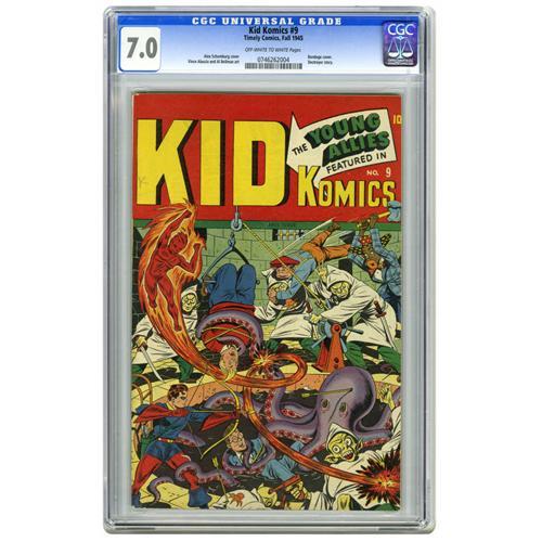 <B>Kid Komics #9 (Timely, 1945) CGC FN/VF 7.0 Off-white to white pages.</B></I> The Young Allies are the Kids in question on this issue's Alex Schomburg cover. Also appearing are the Destroyer and Jap-Buster Johnson. Overstreet 2006 FN 6.0 value = $255; VF 8.0 value = $531. CGC census 3/06: 1 in 7.0, 10 higher.