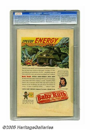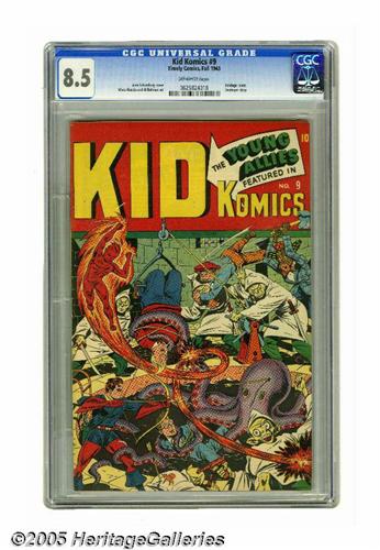 <B>Kid Komics #9 (Timely, 1945) CGC VF+ 8.5 Off-white pages.</B></I> A couple of the Young Allies are octopus bait unless their chums do something quick in another fine example of Alex Schomburg action. In addition to tales of the plucky youngsters, there's a Destroyer backup feature in the issue. Overstreet 2005 VF 8.0 value = $531; VF/NM 9.0 value = $816. CGC census 6/05: 1 in 8.5, 4 higher.