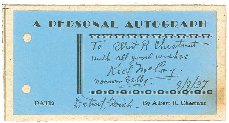 Champion bare-knuckle boxer (1872-1940). Born Norman Selby, he was known for his “corkscrew punch” and dirty tactics; the expression “The Real McCoy” is a fabled reference to him. Life outside of the ring was no less colorful, and Selby was married ten times! After a promising start in early films, he was later tried for robbing and holding a dozen people hostage the day after allegedly murdering his fiancee. Paroled from prison, Selby committed suicide, leaving an enigmatic note that said he “could not endure this world’s madness.” Scarce vintage fountain pen signature and inscription, “To Albert R. Chestnut, with all good wishes, Kid McCoy, Norman Selby, 9/9/37, Detroit, Mich,” on a 5.5 x 2.75 blue card from the Albert R. Chestnut collection. Attached to a slightly larger heavy gray card and in fine condition, with scattered light soling to right edge. From his Pennsylvania home, Chestnut, a printer by profession, began collecting autographs in 1935. He sent these personally-printed cards to over a thousand celebrities and received favorable replies from the vast majority, finally retiring from collecting to raise his family when postage increased from 2¢ per card! Pre-certified Steve Grad/PSA/DNA and RRAuction COA.