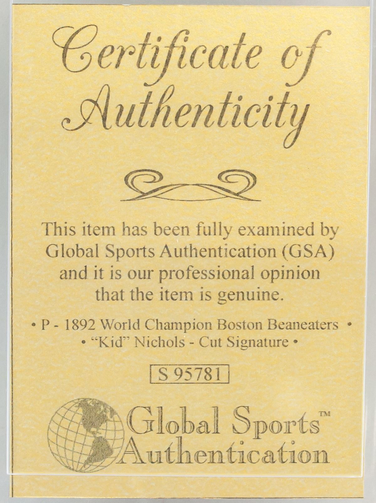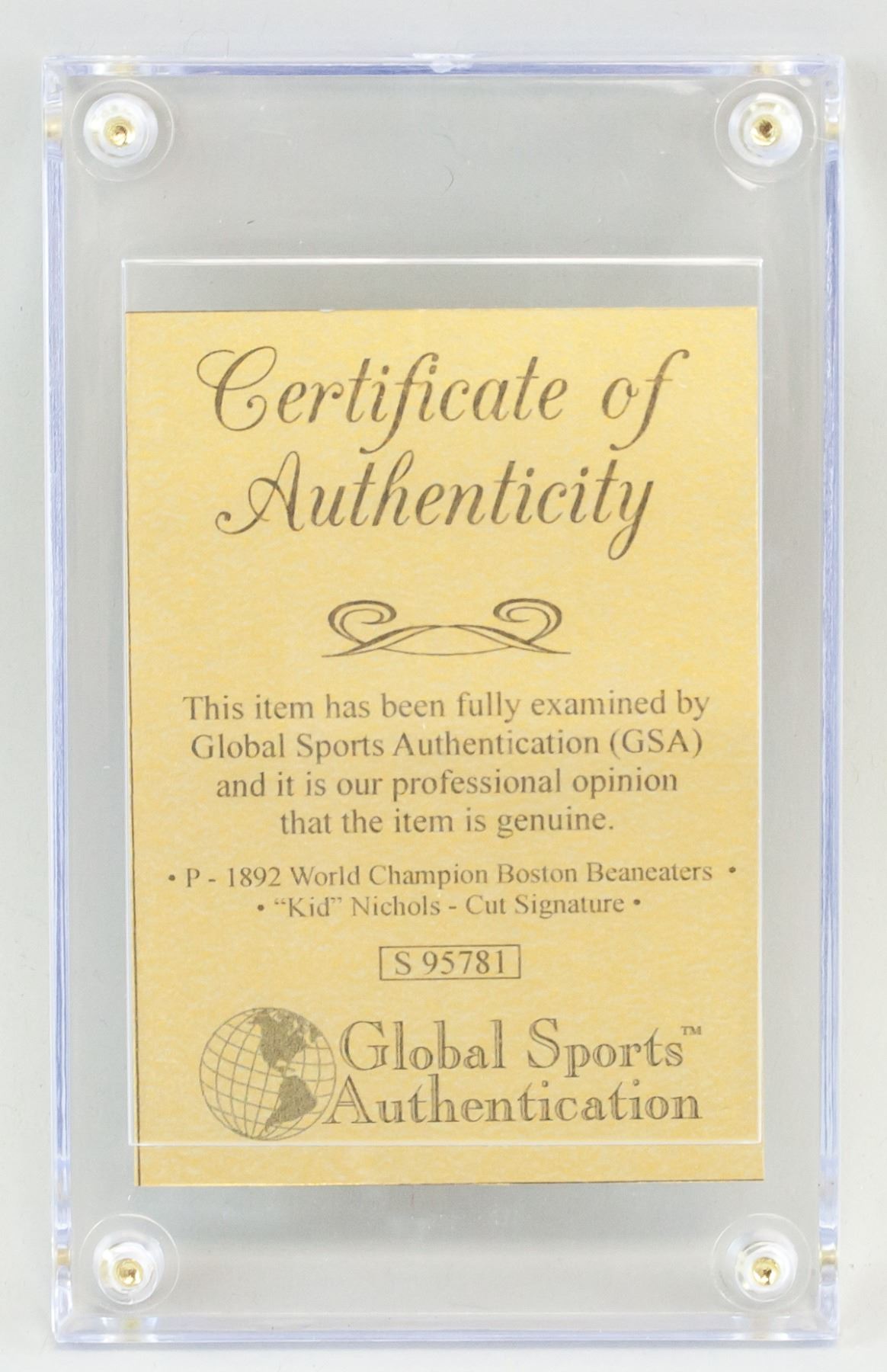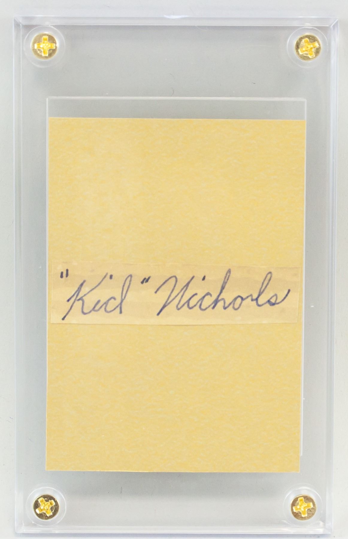 "Kid" Nichols autograph pressed between glass. Accompanied with Certificate of Authenticity. Charles Augustus "Kid" Nichols was an American Major League Baseball pitcher who played for the Boston Beaneaters, St. Louis Cardinals and Philadelphia Phillies from 1890 to 1906. A switch hitter who threw right-handed, he was listed at 5 feet 10 inches and 175 pounds. He is a member of the Baseball Hall of Fame. 1.5 x 6 cm, case size: 13 x 8 cm. Photograph not included in the lot