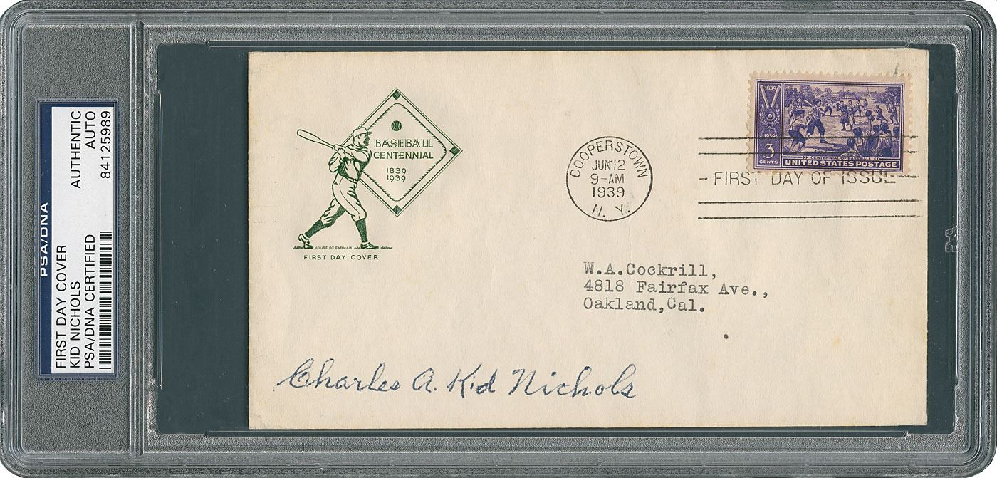 First day cover honoring the centennial of baseball, postmarked at Cooperstown on June 12, 1939, signed in dark blue ballpoint, "Charles A. Kid Nichols." In fine condition. Accompanied by a full letter of authenticity from JSA. This three-cent postage stamp honoring baseball's 100th anniversary was issued in conjunction with the dedication and opening of the National Baseball Hall of Fame in Cooperstown, New York, on June 12, 1939. Known for his dominance on the mound at the end of the 19th century, Nichols became the youngest pitcher to join the 300 Win Club and was elected to the Hall of Fame by way of the Veteran's Committee in 1949 (d. 1953). Encapsulated in a PSA/DNA authentication holder.