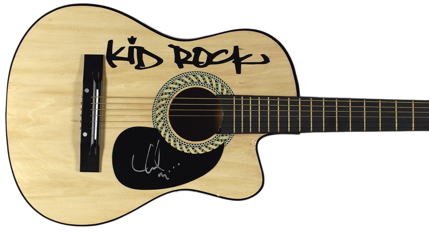 Natural wood-finish six-string acoustic guitar, with Kid Rock’s name on the body, signed on the black pickguard in silver ink. In fine condition. Oversized. RRAuction COA.