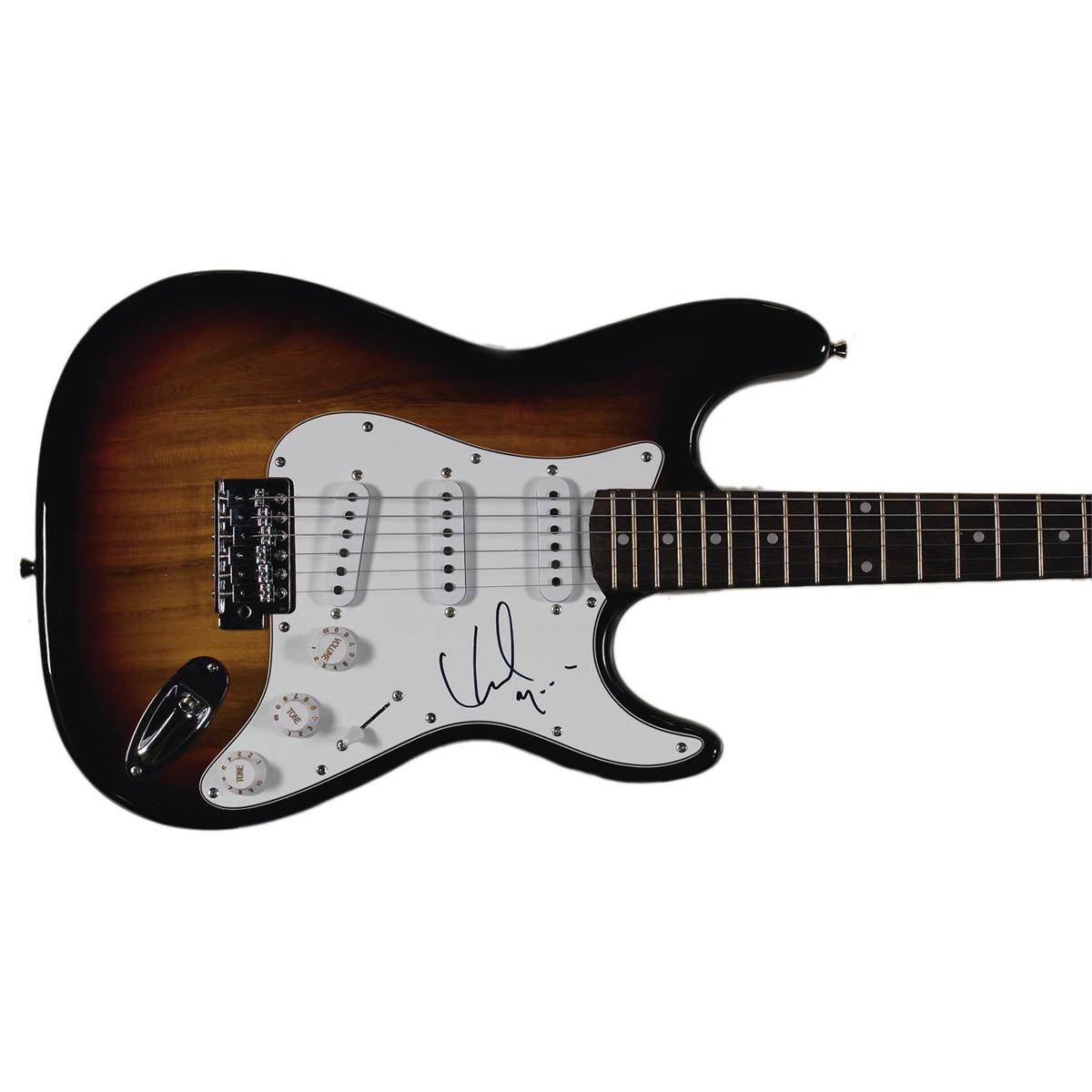 Sunburst-finish Stedman Pro ‘stratocaster-style’ electric guitar, signed on the white pickguard in black felt tip. In fine condition. Accompanied by a photo taken at time of signing. Oversized.