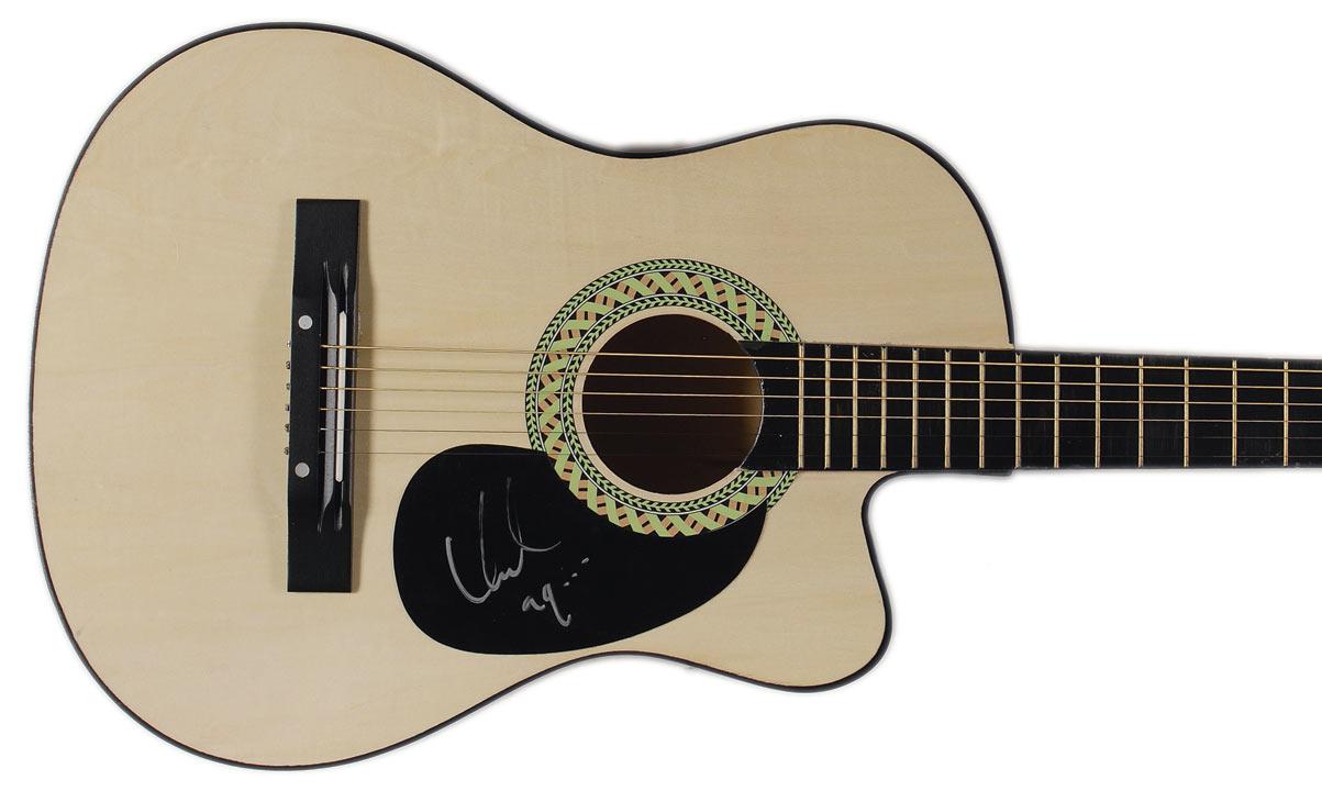 Natural wood-finish six-string acoustic guitar, signed on the black pickguard in silver ink. In fine condition. Oversized.