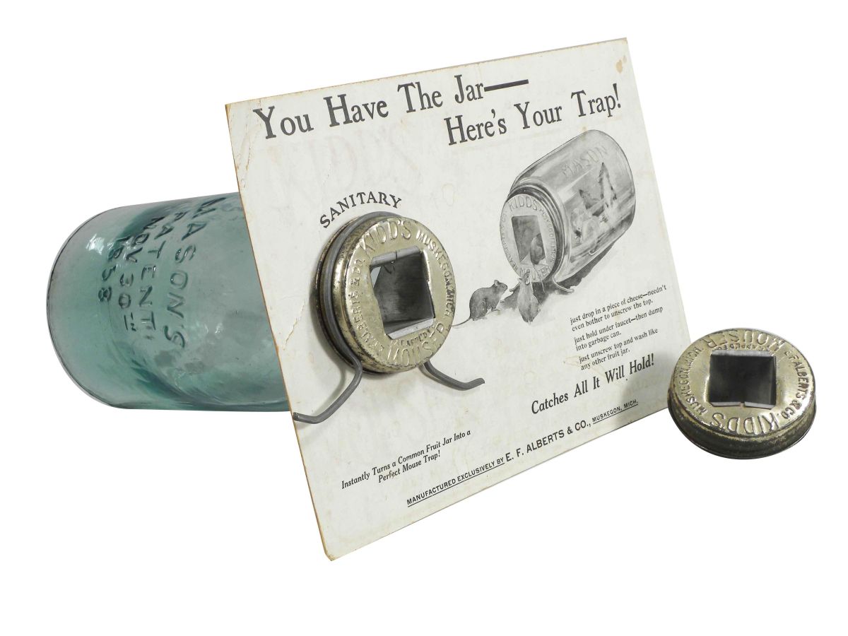Kidd's "Mouster" Sanitary Mouse Trap. E.F. Alberts & Co. Muskegon, Mich. Instantly turns a common fruit jar into a Perfect Mouse Trap! Comes with cardboard stand-up display and two lids. Some minor staining to cardboard otherwise very good condition. 11 X 8 inches.