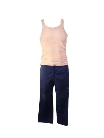 Terry (Lew Temple) screen worn, stunt, brown "Hanes" tank top production soiled, one beaded necklace and leather necklace with a cross, 5 silver rings with various styles, blue uniform"Dickies" production soiled, worn in multiple scenes.