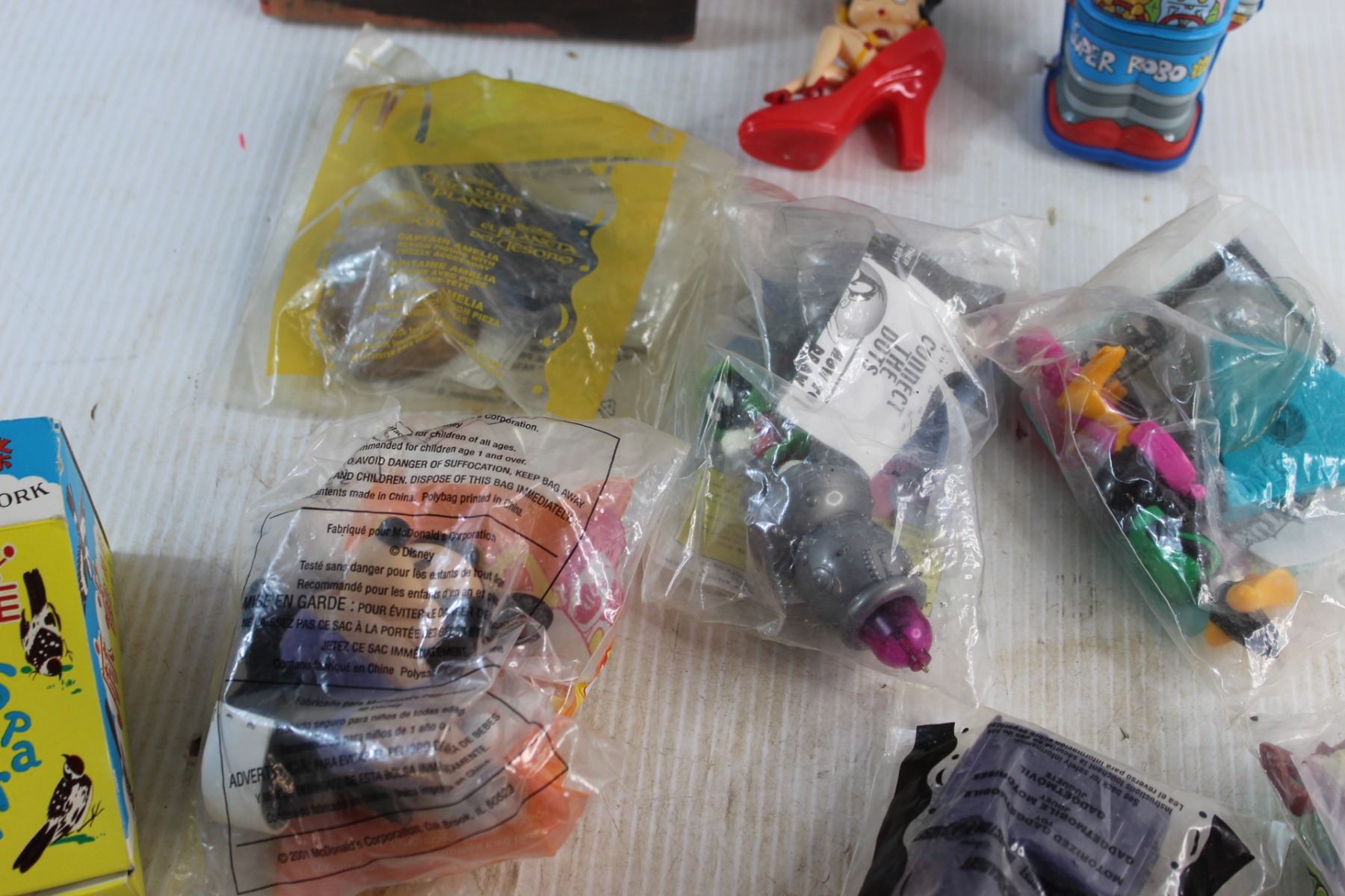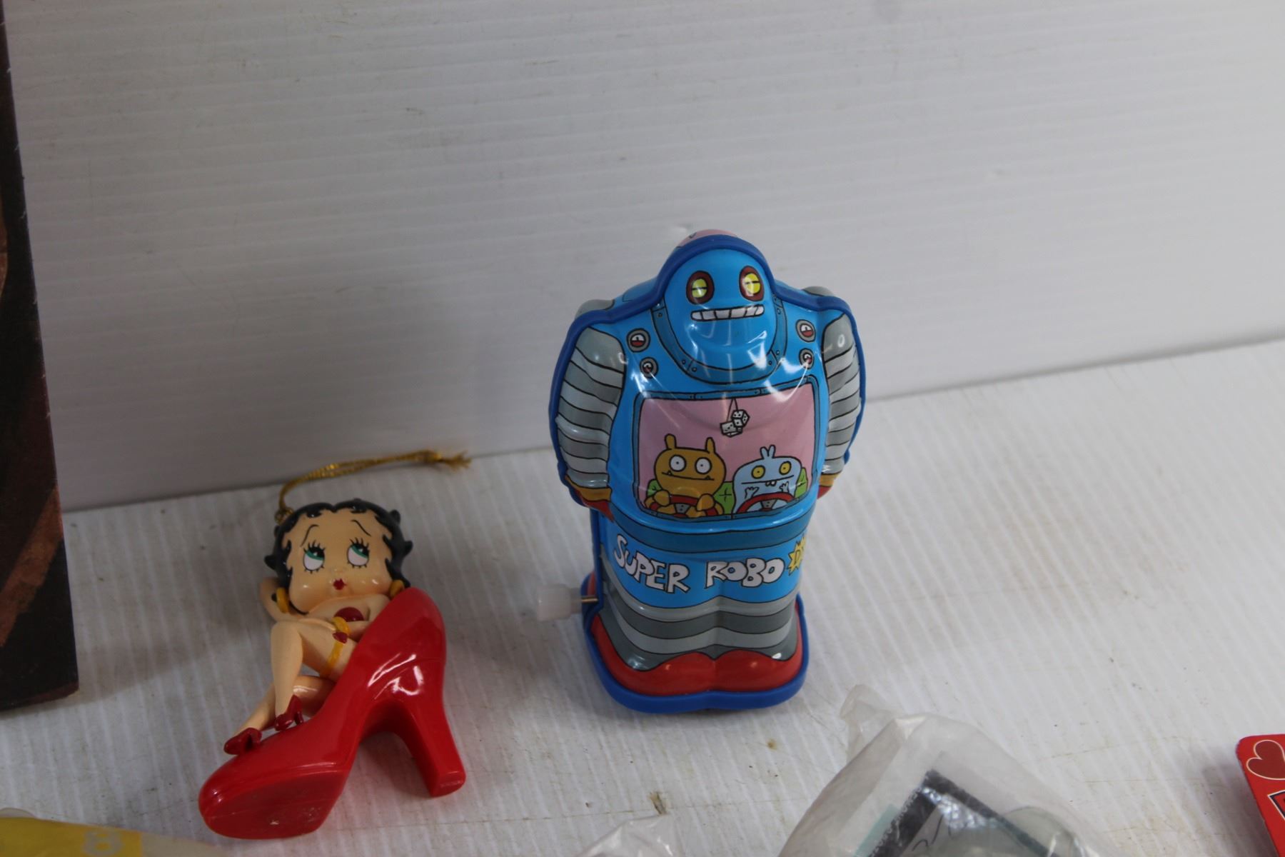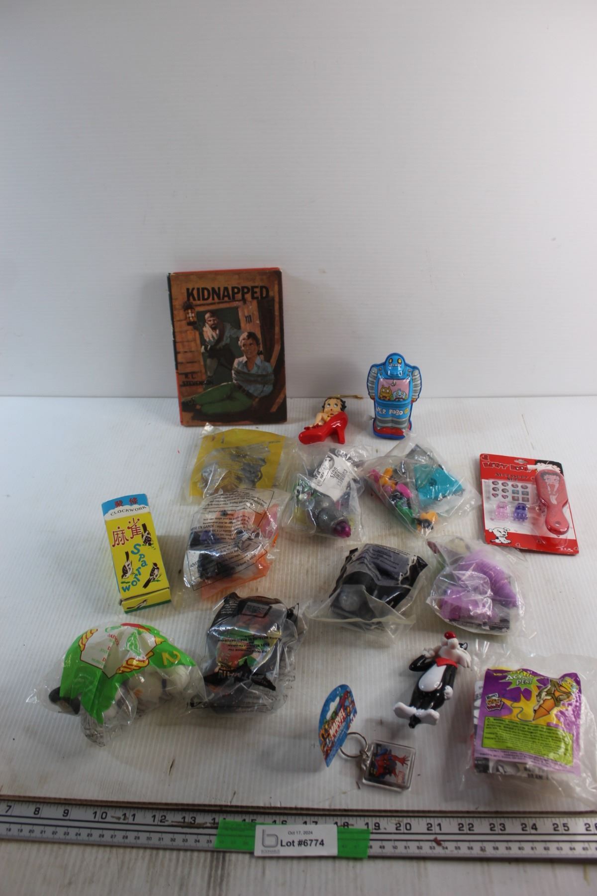 Kidnapped by R.L Stevenson Book, Clockwork Sparrow, Betty Boop Accessory Set, Spider Man Key Chain and Assorted Toys