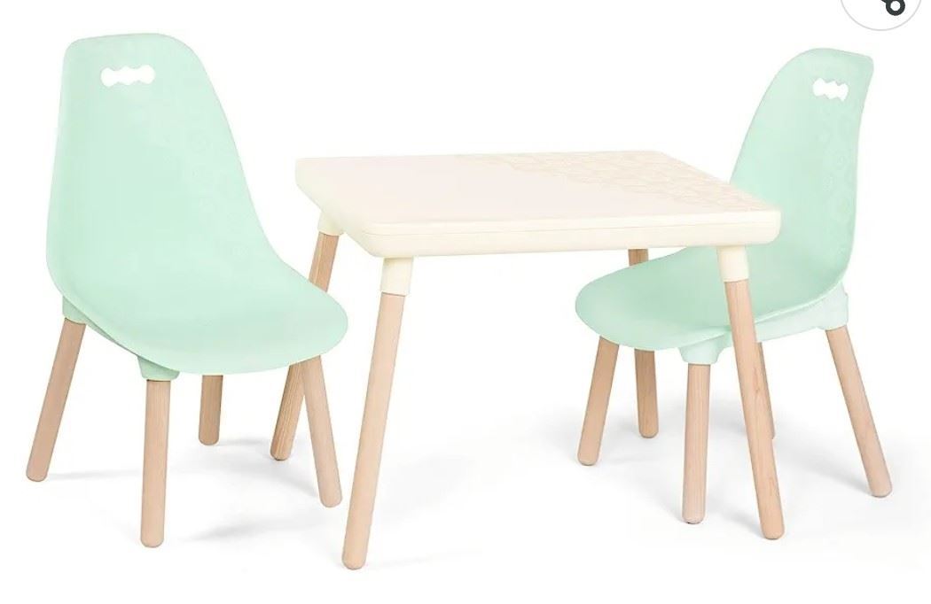 Mint green 2-chair set with matching rectangular table, durable wood and plastic design, new.