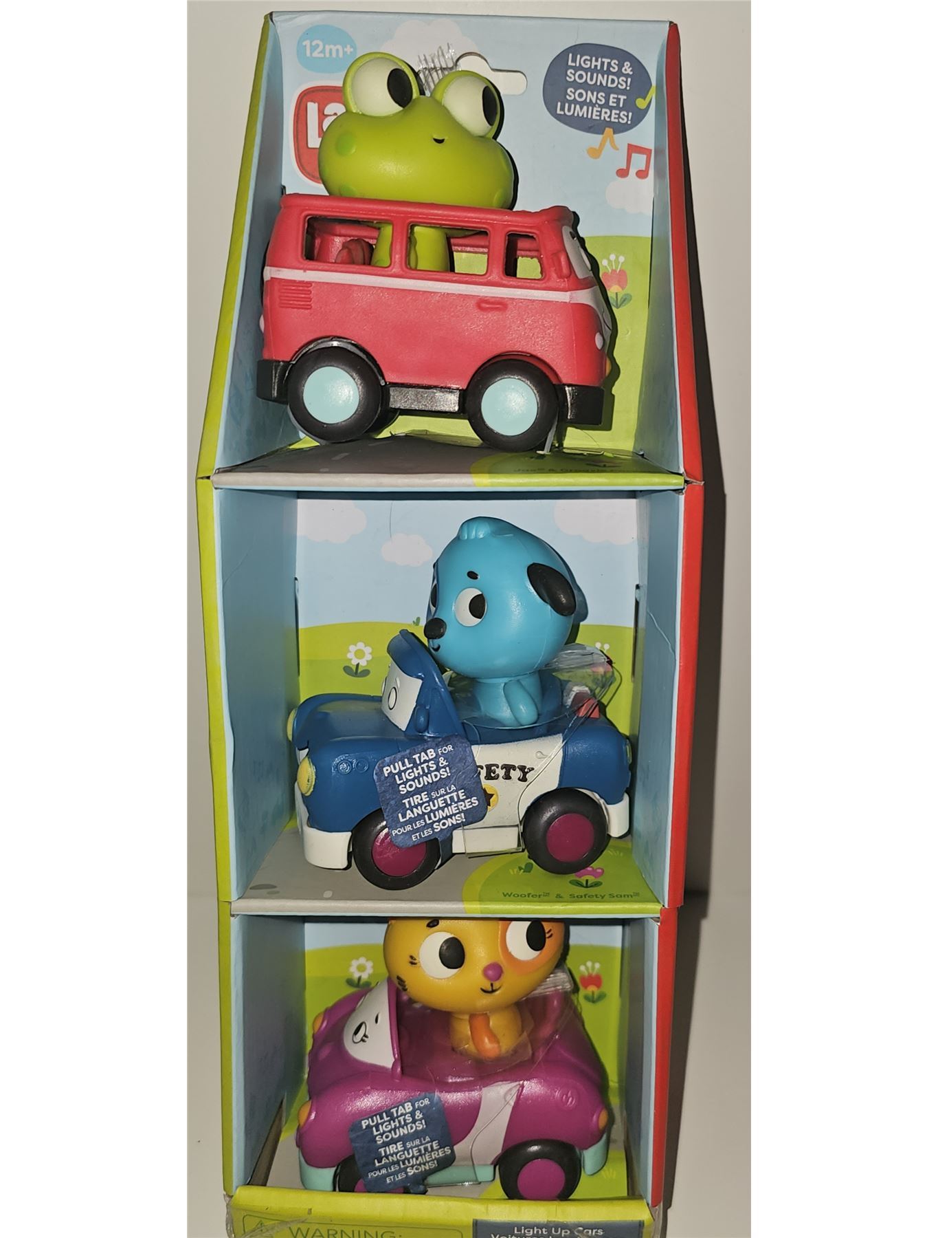 Set of three colorful animal-themed toy cars with lights and sounds, recommended for ages 12 months and up, new.