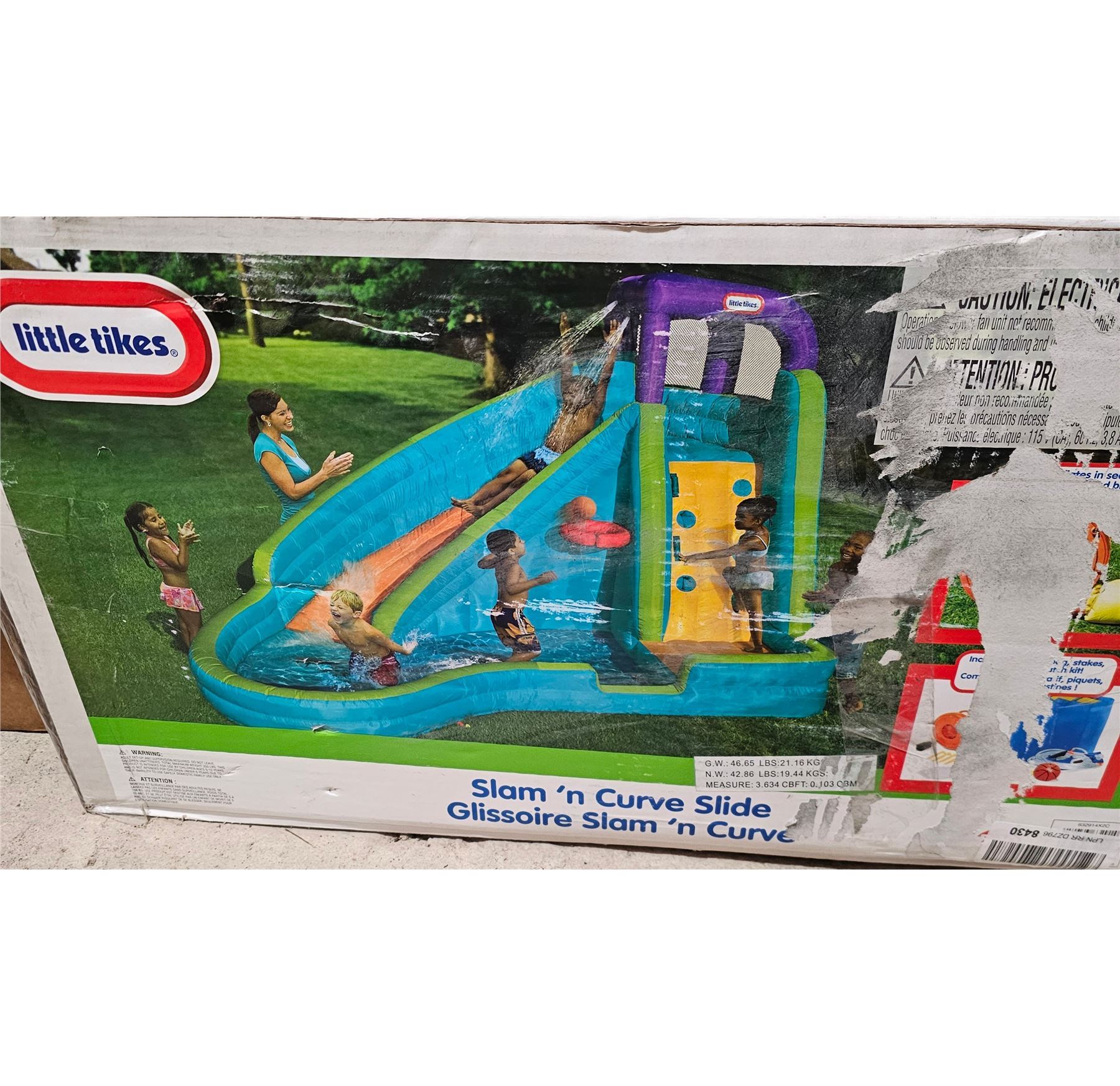 Inflatable backyard water slide with basketball hoop, climbing wall, and splash pool, new. Perfect for outdoor children's entertainment and activities.