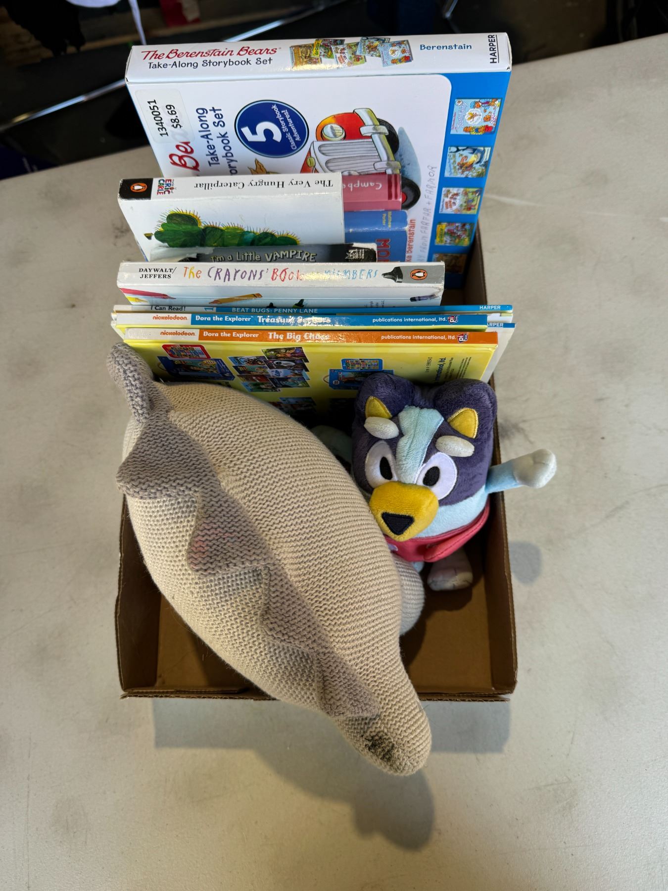 Kids book, stuffy's and Bluey stuffy