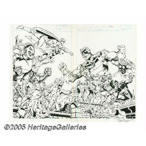<B>Kieron Dwyer and Al Milgrom - The Official Marvel Index to the Avengers #4 Cover Original Art (Marvel, 1987).</B></I> Kieron Dwyer and Al Milgrom present a formation of the Avengers for this cover, which includes Captain America, the Black Panther, Quicksilver, Vision, Scarlet Witch, Thor, Wasp, Yellowjacket, Goliath, and Iron Man. So much excitement couldn't be contained on one mere page, so the artists expanded it into a double-page spread! The back cover includes some of the Avengers' most nefarious foes, including Ultron, Enchantress, Kang the Conqueror, M'Baku the Man-Ape, The Sons of the Serpent, and Red Wolf. The image area measures 21"" x 15"", and the art is in Excellent condition. Signed by Kieron Dwyer at the bottom right. <BR><BR><B>Important notice:</B> Heritage usually auctions material at the rate of 200-250 lots per hour. On some occasions eBay Live bid software or the Internet may not be able to keep up with the pace of the auction. We recommend placing a realistic absentee bid now as insurance to avoid disappointment. Occasionally the auctioneer may eliminate or reject an eBay Live bid, and the auctioneer may also reopen a lot after the close of the eBay live bidding (usually because we missed an audience bid), and may reject your bid even if it shows you as the winning bidder. By bidding via eBay Live, you agree that Heritage may award the lot to another bidder at its sole discretion under the circumstances described above or any other reasonable circumstances. Since eBay bids are not shown to us until we open the lot on the floor, we treat those bids just like floor bids. In most cases the floor responds before the eBay bid is presented to us, due to Internet lag time, so for consistency we have made it a policy that floor bids are always considered first over tie eBay live bids. Also please note that all Heritage lots purchased through eBay Live carry a 20% Buyer's Premium. Please make sure you read the Terms and Conditions before you bid. Th