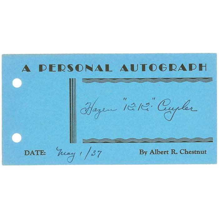 Vintage fountain pen signature, “Hazen ‘KiKi’ Cuyler, May 1, [19]37,” on a 5.5 x 2.75 blue card from the Albert R. Chestnut collection. In fine condition. From his Pennsylvania home, Chestnut, a printer by profession, began collecting autographs in 1935. He sent these personally-printed cards to over a thousand celebrities and received favorable replies from the vast majority, finally retiring from collecting to raise his family when postage increased from 2¢ per card! Pre-certified Steve Grad/PSA/DNA and RRAuction COA.