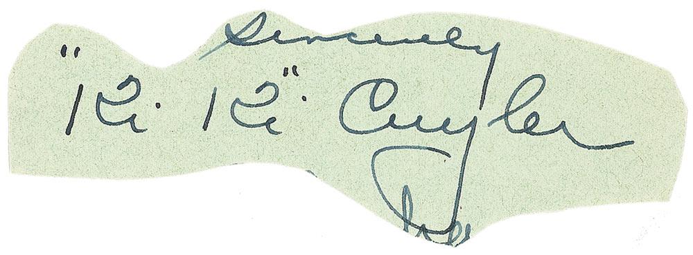 Vintage ink signature, “Sincerely, ‘Ki Ki’ Cuyler,” on a light green irregular and closely trimmed 3.25 x 1.25 album page. In fine condition, with a couple stray ink marks at bottom. Pre-certified Steve Grad/PSA/DNA and RRAuction COA.