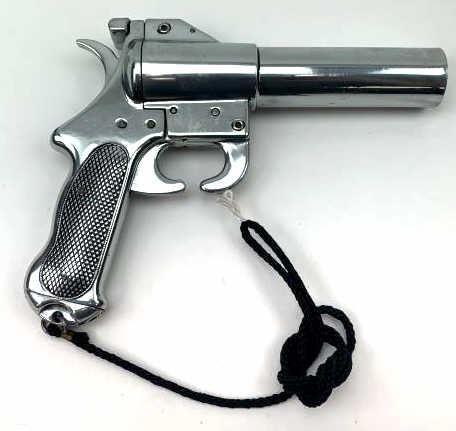 Kilgore Corporation USCG approved flare pistol, Serial #8318. The pistol is in fine overall condition with an 8” barrel retaining nearly all of the nickel finish with the cotton cord lanyard retained. The pistol ismarked USCG approved. Est.: $125-$250.