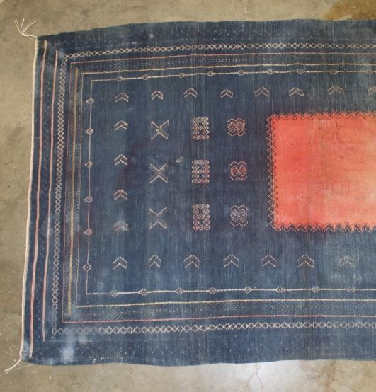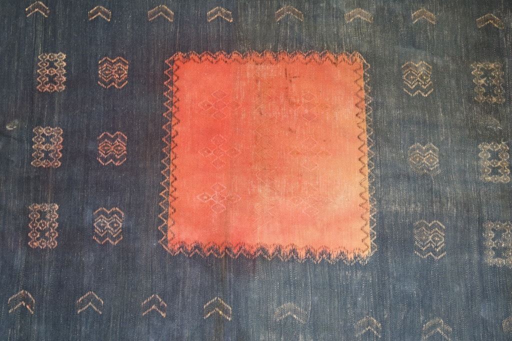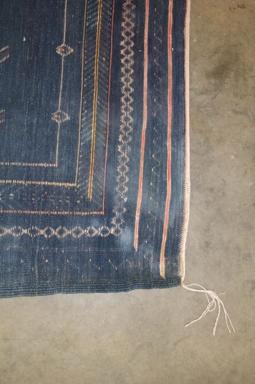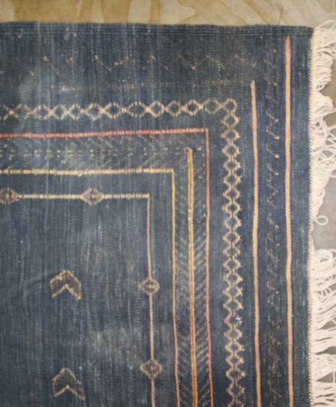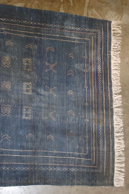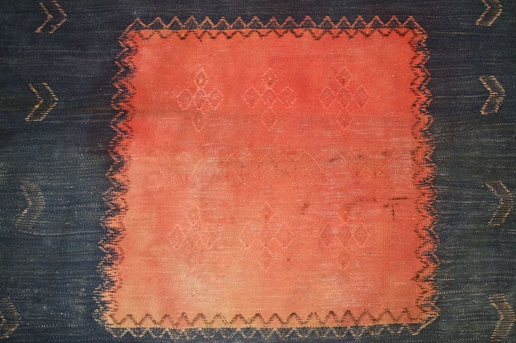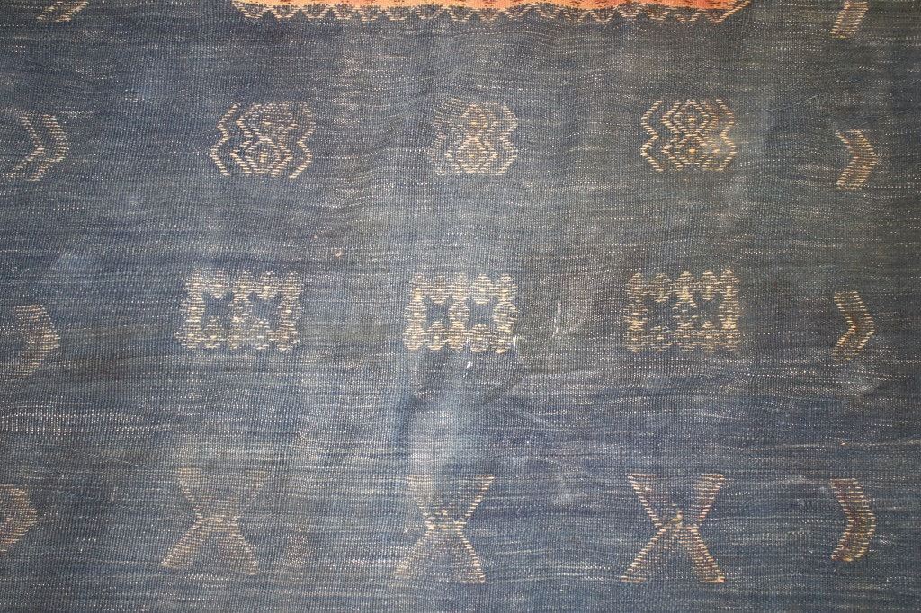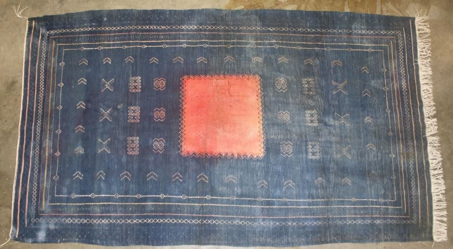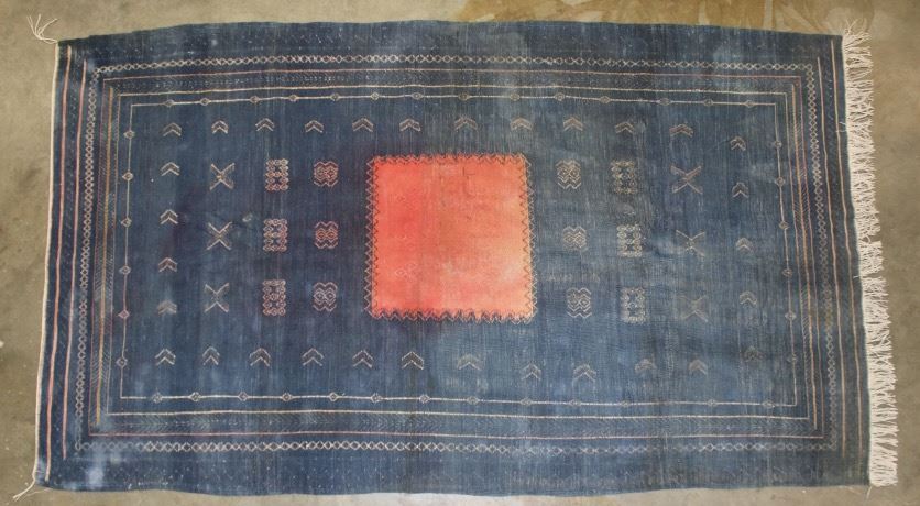 Included in this lot we have a Persian Kilim flat weave wool rug. The rug shows geometric patterns of tan thread on a field of dark blue. The center of the rug shows a red rectangular pattern with red patterns in the field. Kilim denotes a pile less textile of many uses produced by one of several flat weaving techniques that have a common or closely related heritage and are practiced in the geographical area that includes parts of Turkey (Anatolia and Thrace), North Africa, the Balkans, the Caucasus, Iran, Afghanistan, Pakistan, Central Asia and China. The piece shows good condition overall with some minor wear. The rug measures 70 1/2" wide by 122" long