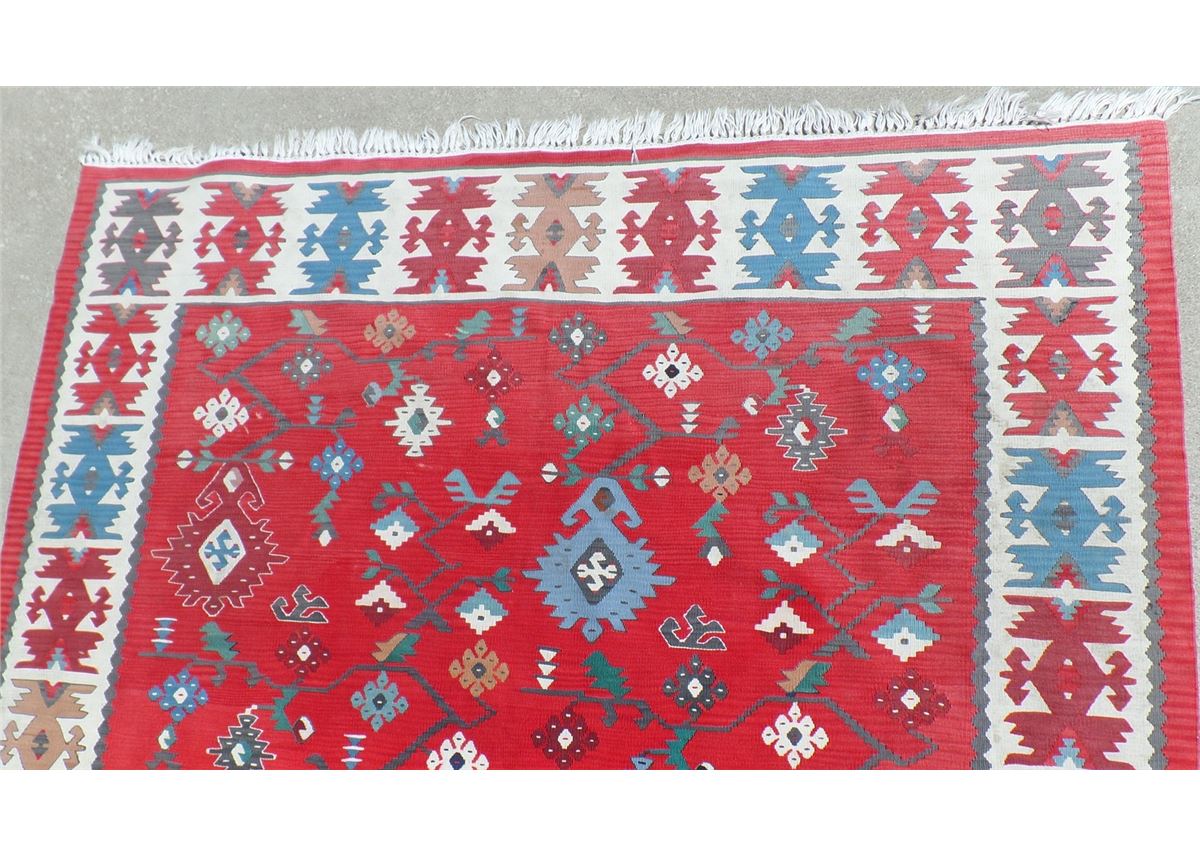 Kilim Rug from the 1960's measuring 64 x 96 inches. This item is made from wool and is from Kilim, Afghanistan. There is very minor bleeding on one end. There also is fading on one side. This is a very colorful Middle Eastern Rug. Shipping $30
