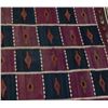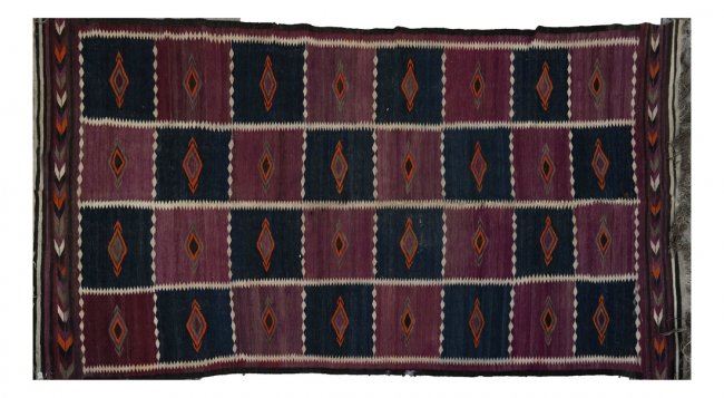 Kilim flat weave rug in geometric pattern. 146" x 72"]. Few holes in one medallion square. Damage to border.