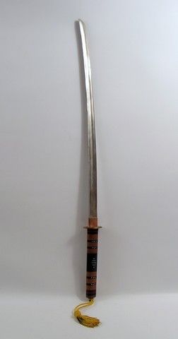 A carefully crafted Ninja Sword from "Kill Bill: Vol 1" (2003). The blade is made of high-polished aluminum, with a VERY sharp edge (perhaps used to actually cut a prop, set piece or worse!). Faux copper and brass hilt and special ceremonial inlayed handle with button-butt and gold tasseling. Double sided sheath: one side wood, the other side faux-ivory look with inlay design. Approx 38" long.
