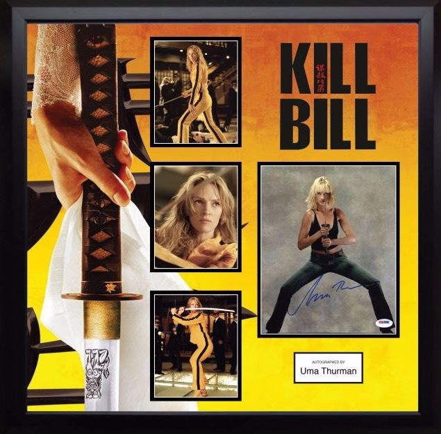 Custom framed Kill Bill signed photo and movie collage. Photo autographed by Uma Thurman. Approximate dimensions are 24x24. This item is authenticated by PSA. This item comes with a Certificate of Authenticity from a third party authenticator. This Certification of Authenticity does not imply that the item will be certified by any other rival authentication companies. The accompanied certification is the only certification the auction company can confirm. These items are being sold as collectable pieces and there is no guarantee that this item can be resold on any online marketplace. Each of these companies has their own policies and politics.