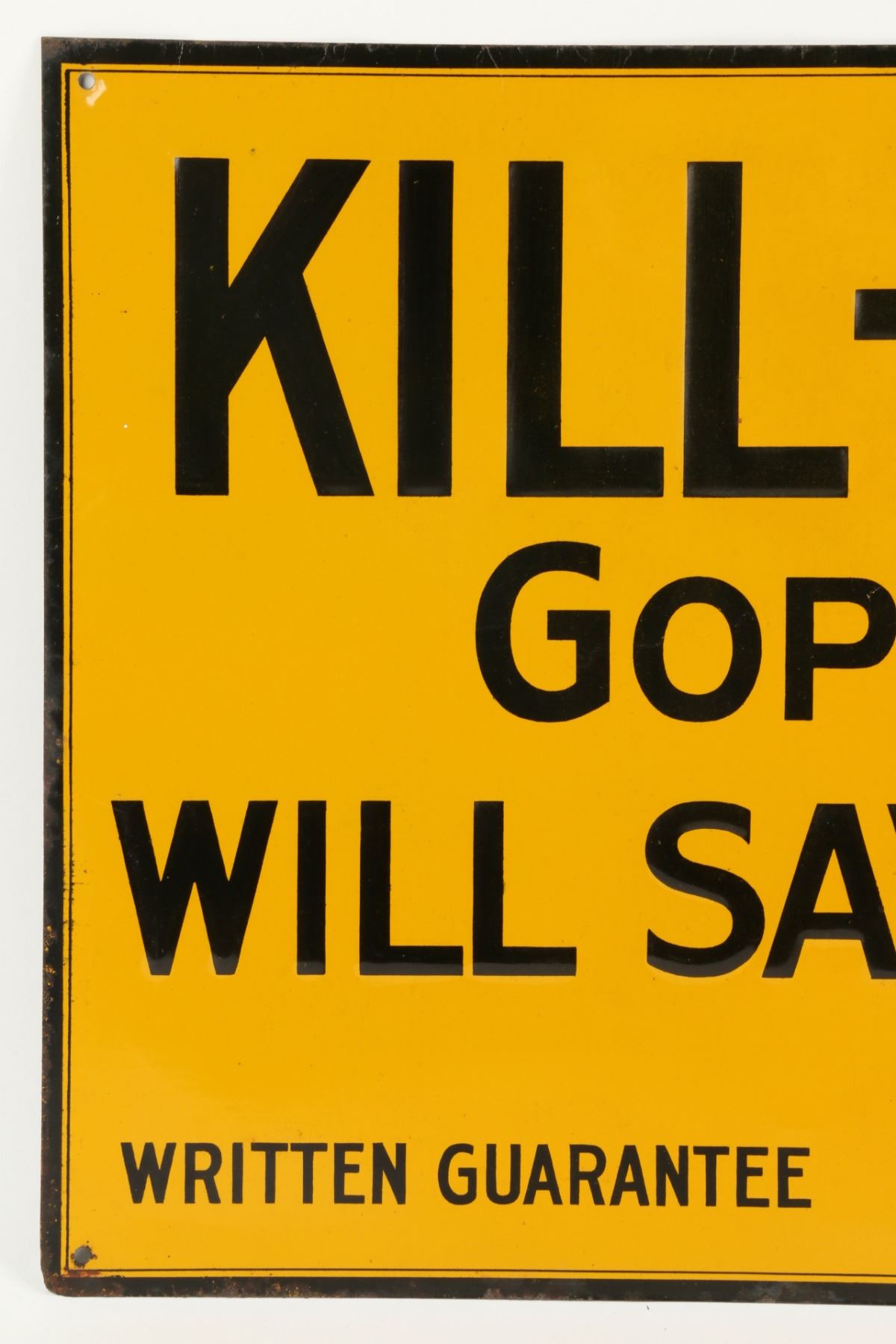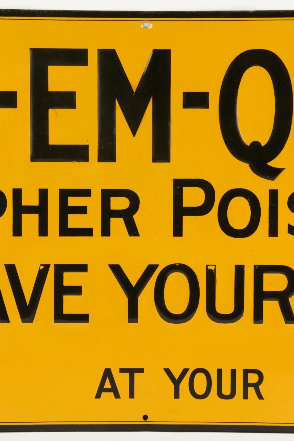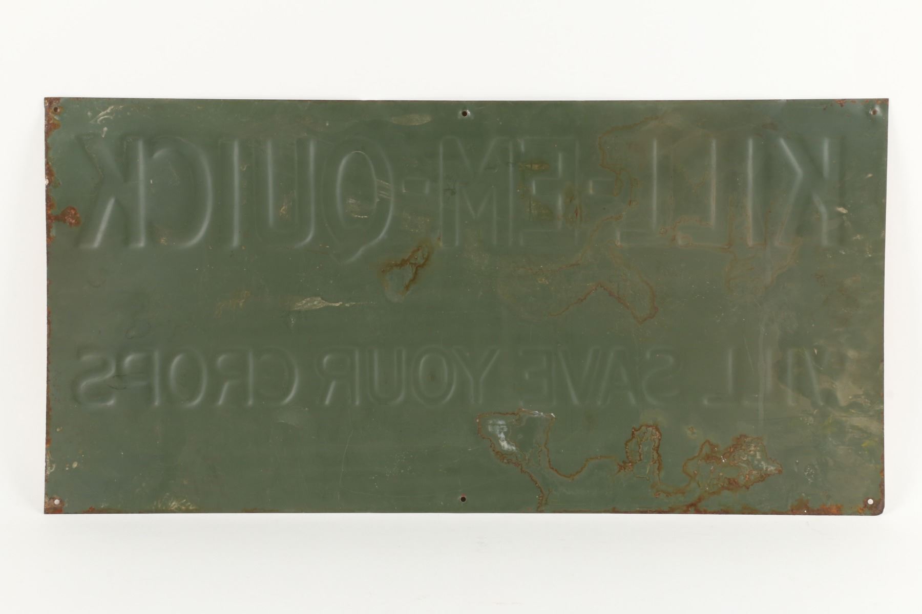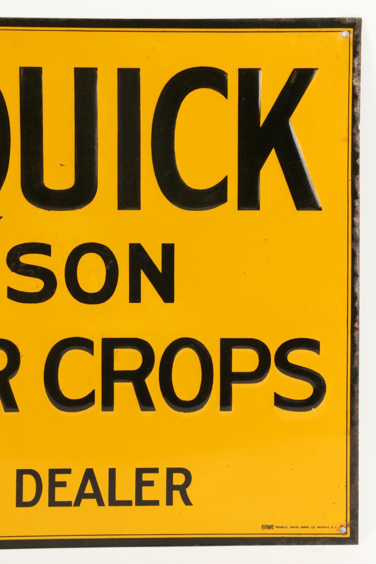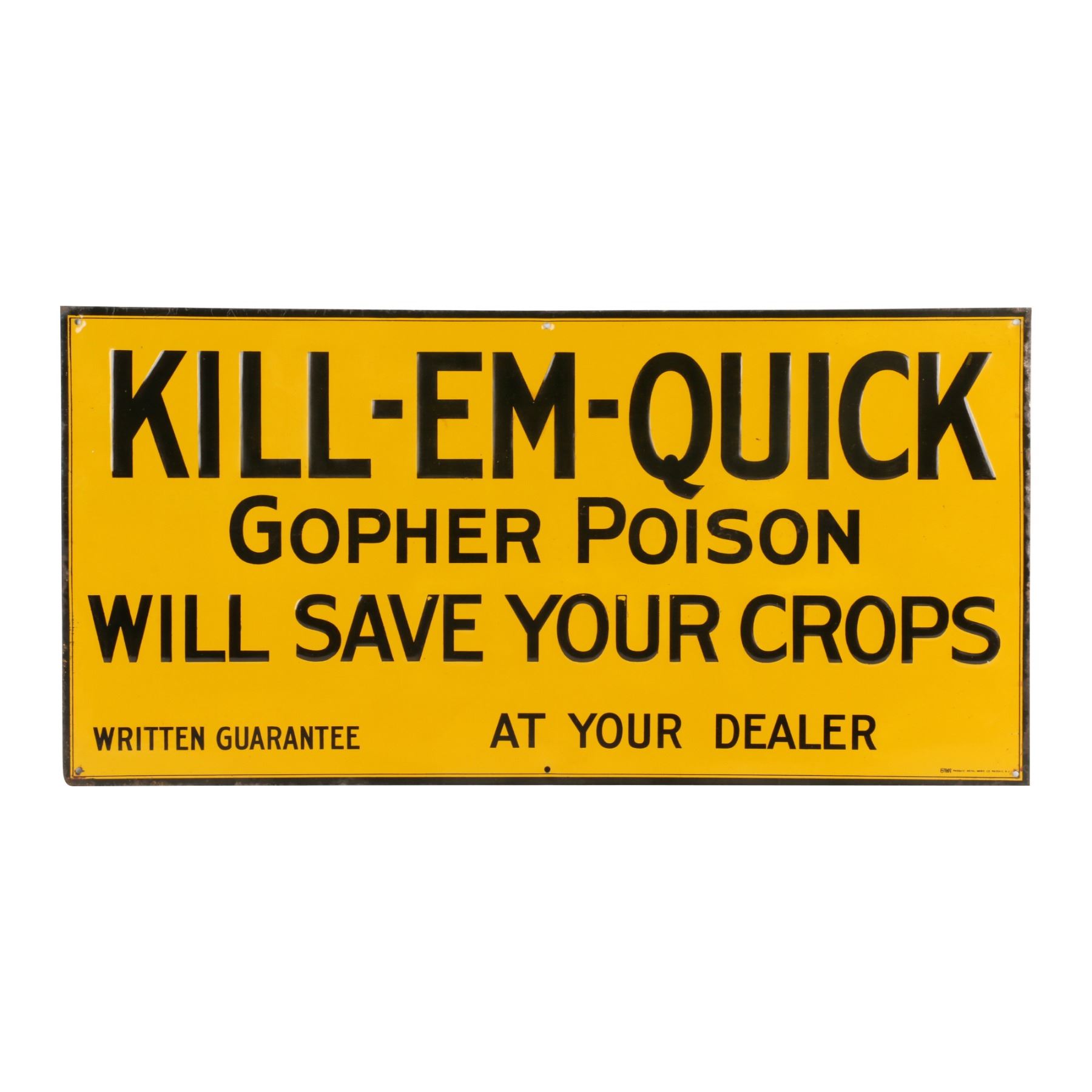 American. Circa 1920. Rare. Embossed text. Marked, "Stelad Signs - Passaic Metal Ware Co., Passaic N.J" lower right edge. 23.75" x 11.75". Light edge wear, surface crazing. 300-500.