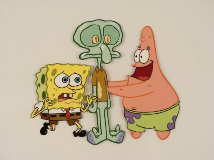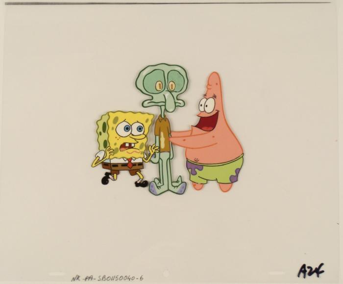This original animation cel is from the Nickelodeon TV show SpongeBob Squarepants. The story takes place under the deep blue sea in Bikini Bottom, where SpongeBob resides. SpongeBob, who is a yellow, porous sponge, is your typical happy-go-lucky character, as he is always cheerful and enjoys making people laugh. Patrick Star, SpongeBob's neighbor who is a starfish, is your average children's show idiot, as he boasts knowing nothing and is often getting himself into ridiculous situations. Between the homes of these two lies the home of the miserable Squidward, a squid, who is known for being grouchy and playing tricks on SpongeBob and Patrick. Both SpongeBob and Squidward work at the Krusty Krab, a fast food business run by the greedy money-loving Mr. Krabs, a crab, the arch rival of the evil, possibly misunderstood, Plankton. Another neighbor, Sandy Cheeks, an athletic squirrel who normally wears an astronaut's space suit, was introduced in "Tea at the Treedome." She spends most of her time inventing and experimenting. Did SpongeBob and Patrick kill Squidward?Original Production Animated Cel Overall Size of Cel: 10 1/2" x 12 1/2" Very Good ConditionThis is an original hand-painted cel set-up used in the production of an episode of "SpongeBob SquarePants." Each one-of-a-kind set-up represents a slight change in position of the characters. When individually photographed and projected in rapid succession, the images appear to move.