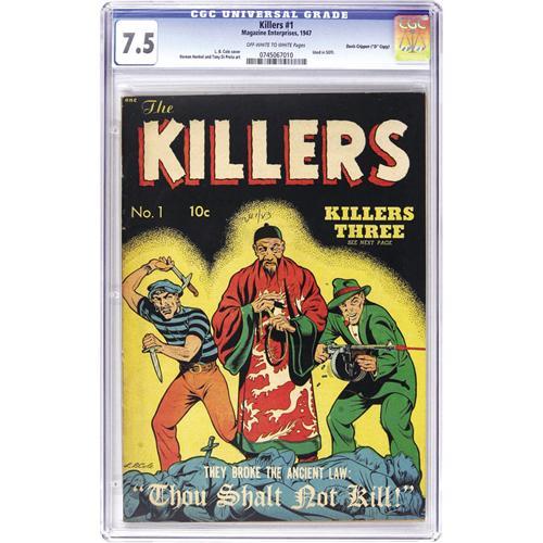 <B>Killers #1 Davis Crippen ("D" Copy) pedigree (Magazine Enterprises, 1947) CGC VF- 7.5 Off-white to white pages.</B></I> Davis Crippen collected every comic from the innocuous to the notorious, and this one's firmly in the latter category - three killers are the heroes! The comic was mentioned in <B>Seduction of the Innocent</B></I> and used in hearings by the New York Legislative Commission. The cover is by L. B. Cole. Overstreet 2006 VF 8.0 value = $681. CGC census 6/06: in 7.5, higher. <I>From the Crippen Collection.</B></I> <BR><BR><B>Important notice:</B> Heritage usually auctions material at the rate of 200-250 lots per hour. On some occasions eBay Live bid software or the Internet may not be able to keep up with the pace of the auction. We recommend placing a realistic absentee bid now as insurance to avoid disappointment. Occasionally the auctioneer may eliminate or reject an eBay Live bid, and the auctioneer may also reopen a lot after the close of the eBay live bidding (usually because we missed an audience bid), and may reject your bid even if it shows you as the winning bidder. By bidding via eBay Live, you agree that Heritage may award the lot to another bidder at its sole discretion under the circumstances described above or any other reasonable circumstances. Since eBay bids are not shown to us until we open the lot on the floor, we treat those bids just like floor bids. In most cases the floor responds before the eBay bid is presented to us, due to Internet lag time, so for consistency we have made it a policy that floor bids are always considered first over tie eBay live bids. Also please note that all Heritage lots purchased through eBay Live carry a 22.5% Buyer's Premium. Please make sure you read the Terms and Conditions before you bid. This lot is being auctioned in conjunction with a live floor auction by Heritage Auction Galleries. All final auction and invoice information will be supplied by Heritage Auction Galleries, and all other information should be considered preliminary. Lot:41001 <BR><BR><B>Winning Notification and Billing:</B> After the FINAL session in this auction is complete, Heritage will send e-mail and snail mail invoices. This process normally takes several days. All final auction and invoice information will be supplied by Heritage Auction Galleries, and all other information should be considered preliminary. <BR><BR>This auction will be conducted on a live auction floor and over the Internet through eBay Live. If you choose to place an absentee bid, please take a moment to <font color='#0000ff'><u><a href='http://pages.ebay.com/liveauctions/help/before/laabsentee.html'>learn how eBay Live absentee bidding works</a></u></font><font color='#000000'>
